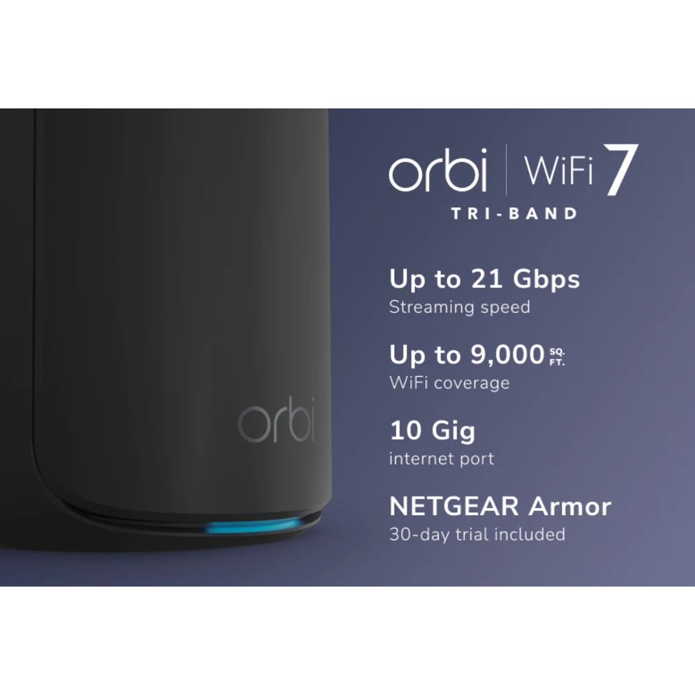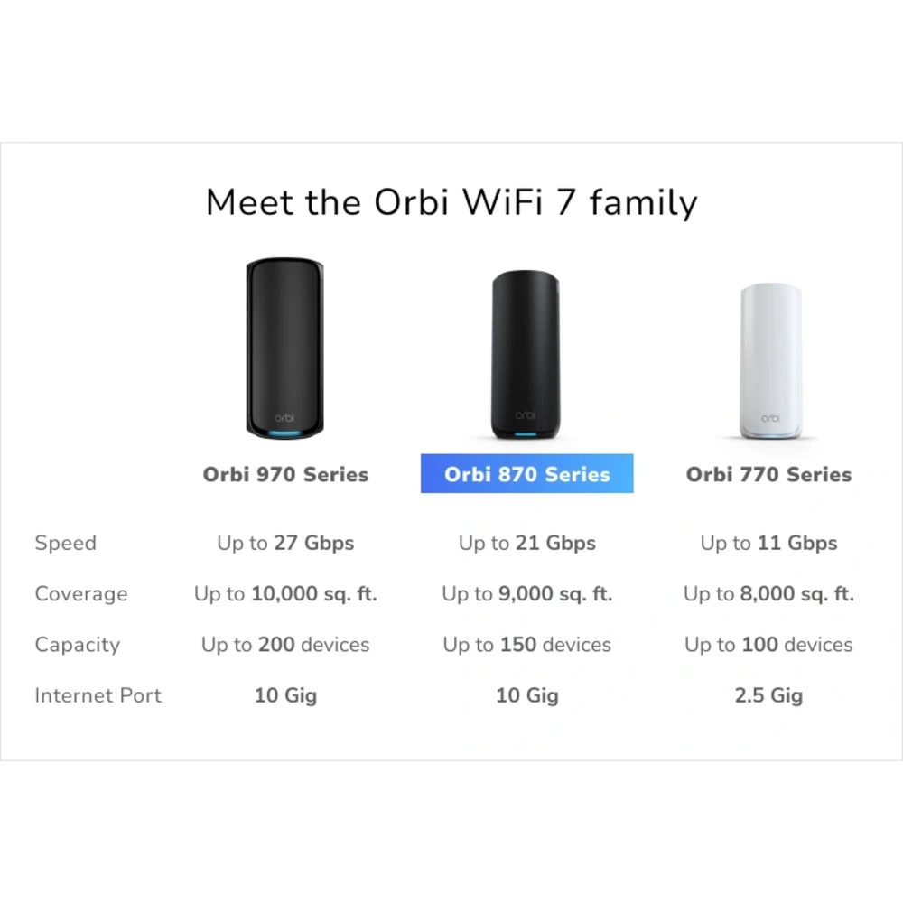 NETGEAR Orbi 870. Product colour: Black, Antenna type: Internal, Product type: Mesh system. Wi-Fi band: Tri-band (2.4 GHz / 5 GHz / 6 GHz), Top Wi-Fi standard: Wi-Fi 7 (802.11be), WLAN data transfer rate (max): 21000 Mbit/s. Processor frequency: 1.5 GHz, Internal memory: 2000 MB, Flash memory: 4000 MB. Width: 146.8 mm, Depth: 112.4 mm, Height: 270.3 mm. Number of products included: 1 pc(s)