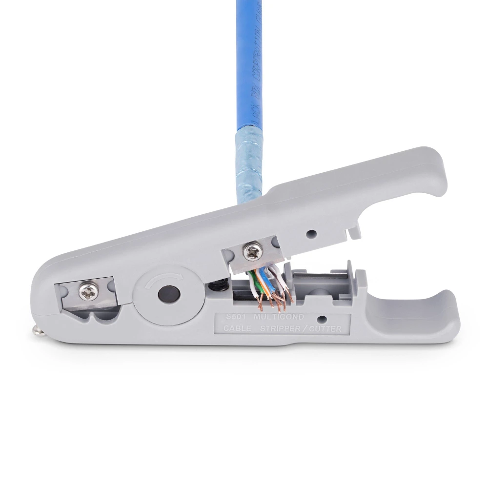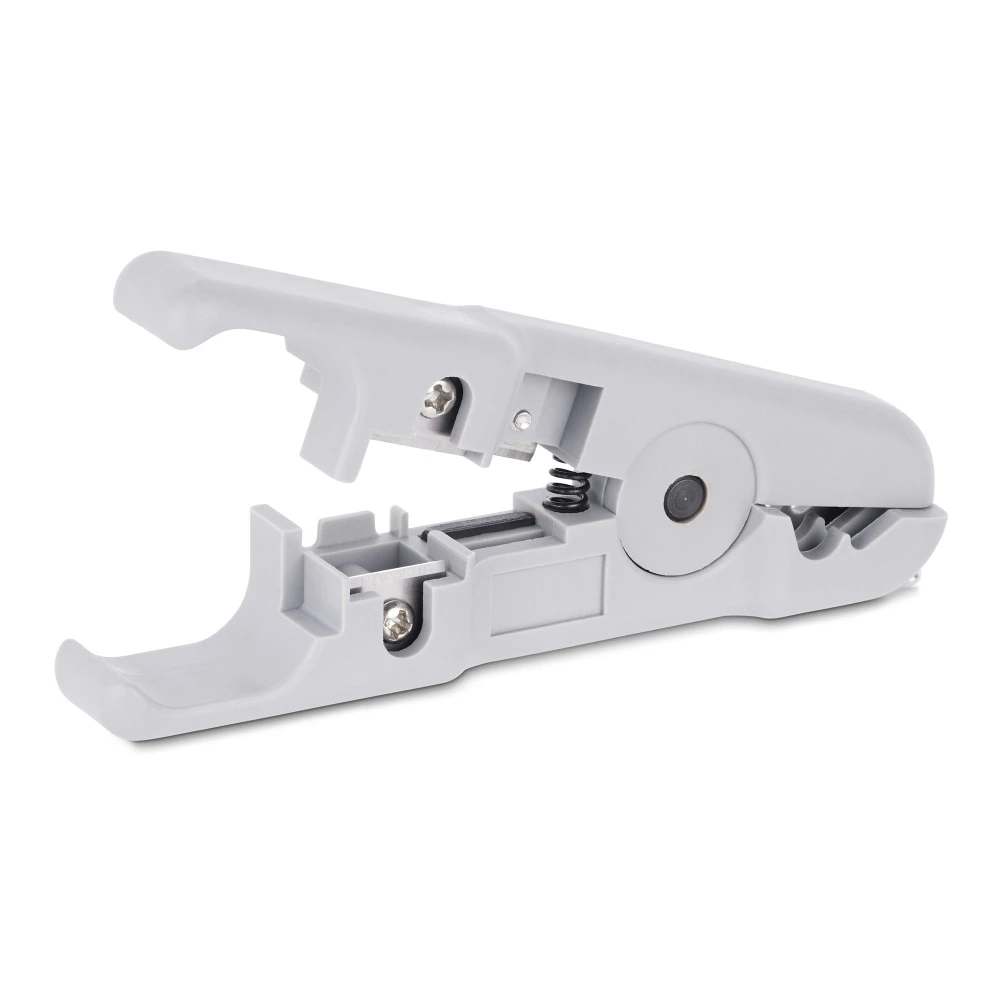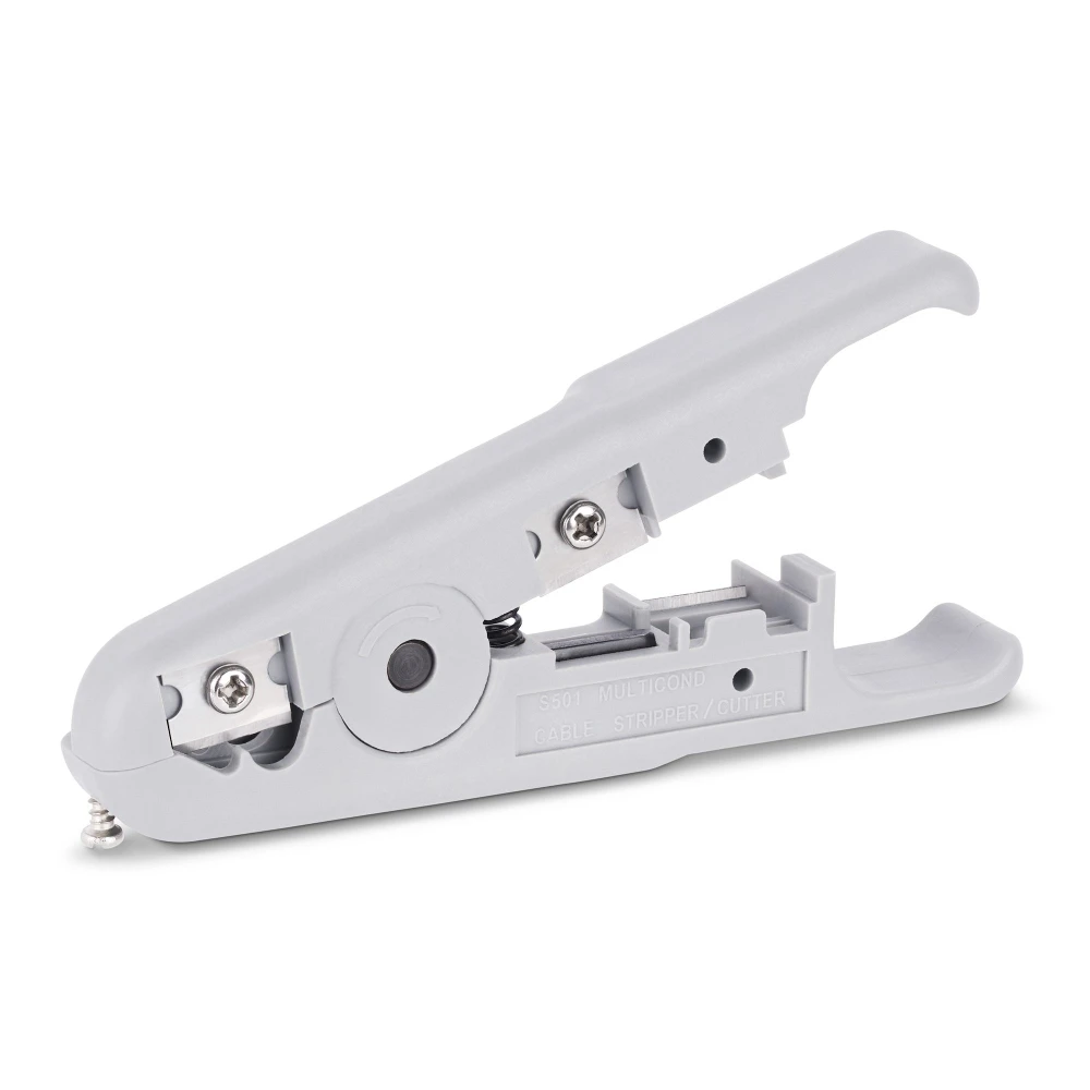 Strip and cut UTP/FTP/STP/coaxial and multi-conductor cables with 360-degree rotation for controlled jacket and insulation removal - Supports a wide range of round and flat cables w/dedicated stripping slots - Fits 3.5mm to 7.5mm (0.13in to 0.29in) cable outer diameter; Modify the clamping height using the Phillips head adjustment screw to match cable thickness - Dedicated cutting slot fits round and flat cables for fray-free cutting; Compact form factor is ideal for quick access