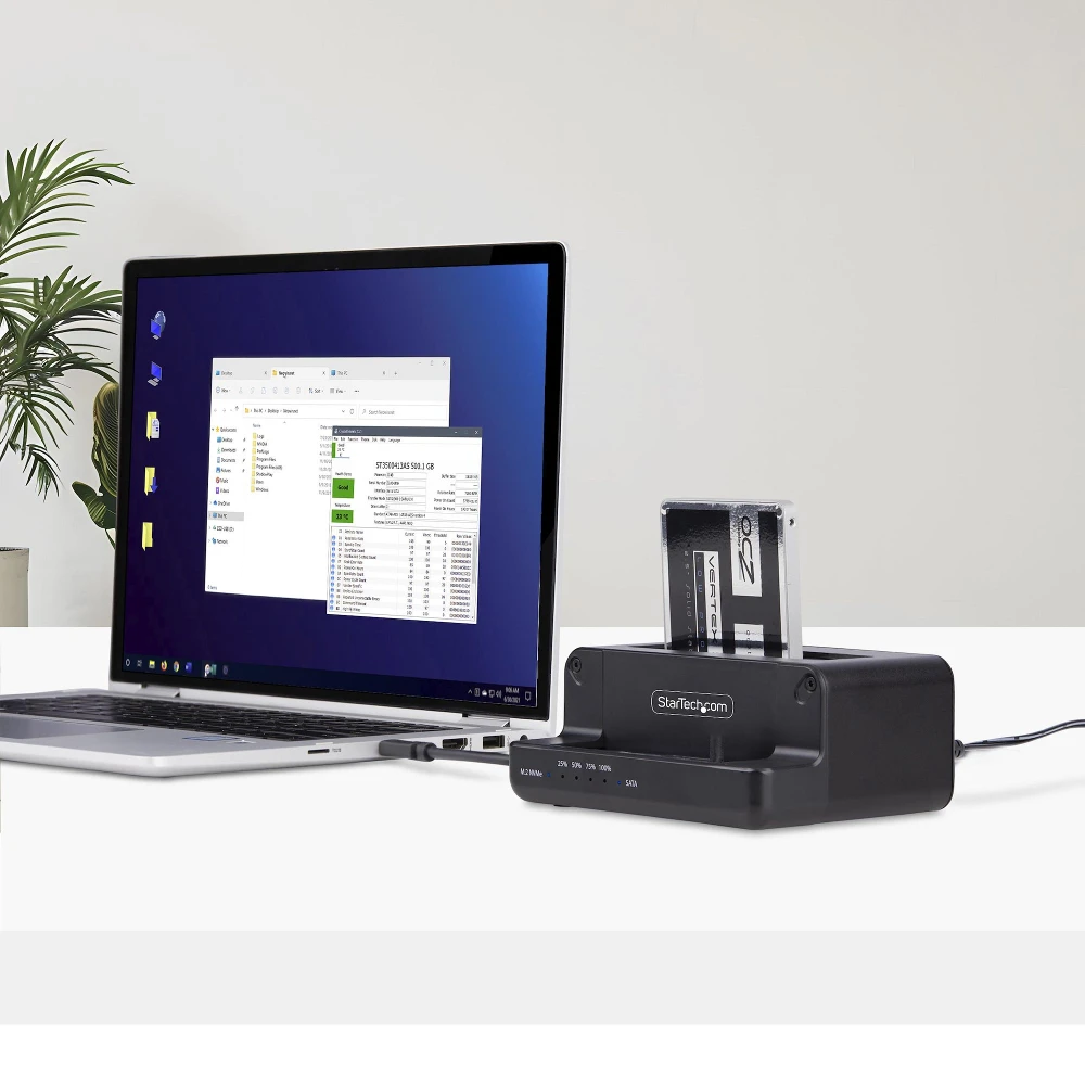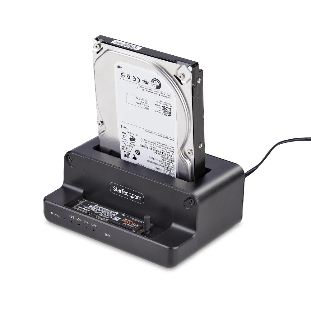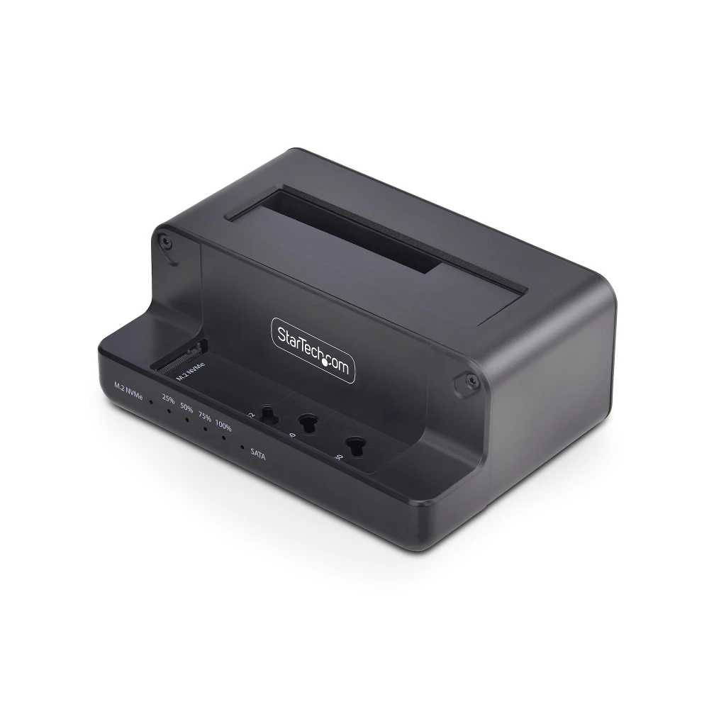 Copy an M.2 NVMe drive to a 2.5/3.5in SATA SSD/HDD, or clone from a SATA drive to M.2 NVMe without a computer - Sector-by-sector duplication copies the entire drive up to 27GBpm; Works with any file format - USB 10Gbps (USB 3.2) host port for fast data transfer - No drivers/software required; Progress/Status/Power LEDs - Toaster-style SATA drive bay supports any 2.5/3.5in SATA drive; M.2 NVMe slot fits 2242/2260/2280 sizes; Target drive must be equal to (or larger than) the source drive