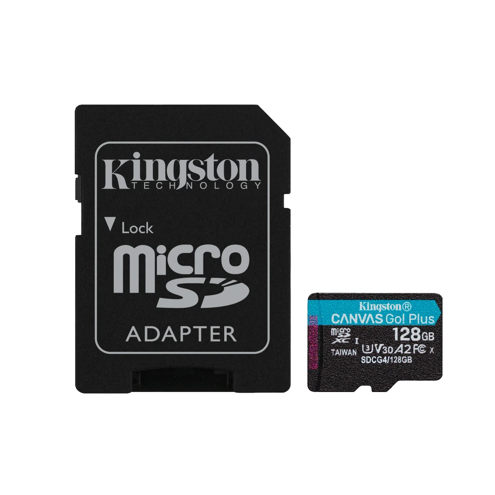 Kingston Technology 128GB microSDXC Canvas Go Plus Gen4 200MB/s A2 U3 V30 Card + Adapter. Capacity: 128 GB, Flash card type: MicroSD, Flash memory class: Class 10, Internal memory type: UHS-I, Read speed: 200 MB/s, Write speed: 100 MB/s, UHS Speed Class: Class 3 (U3), Video Speed Class: V30. Product colour: Black, Turquoise