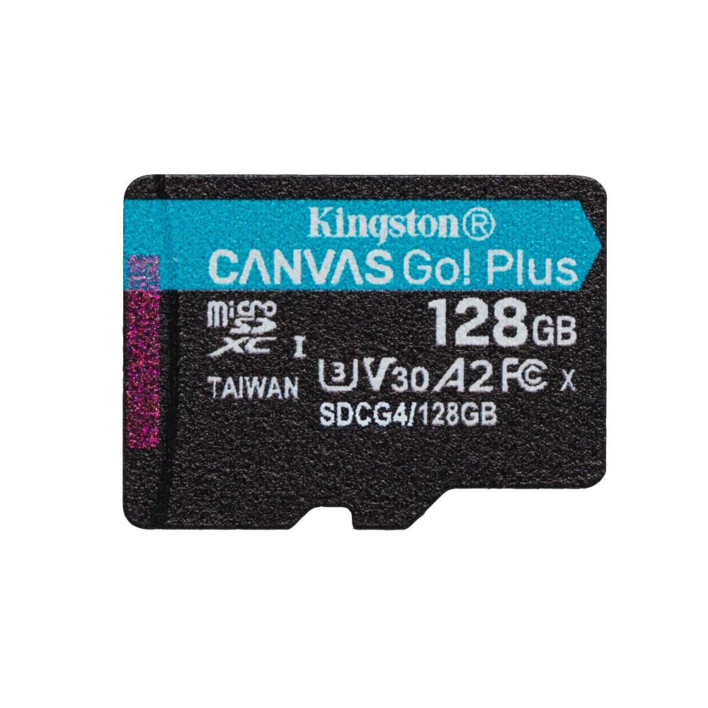 Kingston Technology 128GB microSDXC Canvas Go Plus Gen4 200R A2 U3 Single Pack w/o ADP. Capacity: 128 GB, Flash card type: MicroSD, Flash memory class: Class 10, Internal memory type: UHS-I, Read speed: 200 MB/s, Write speed: 100 MB/s, UHS Speed Class: Class 3 (U3), Video Speed Class: V30. Product colour: Black, Turquoise