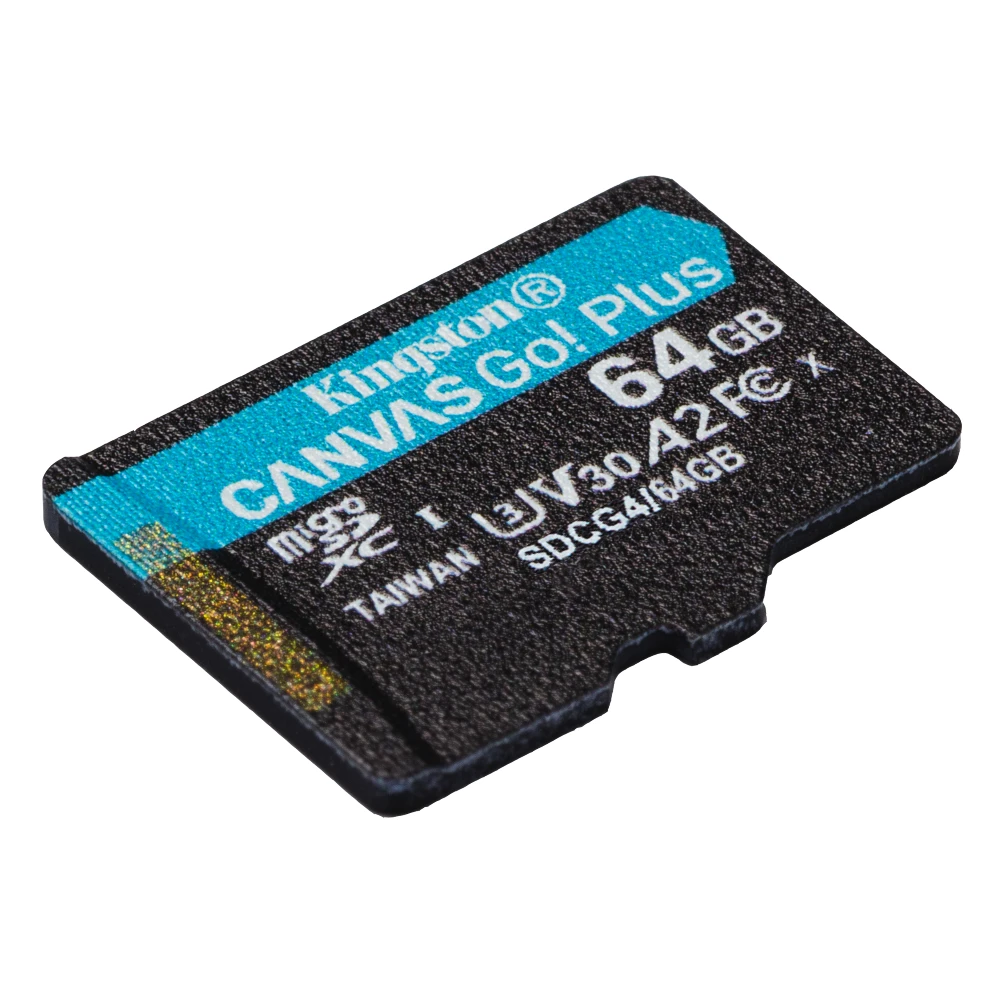 Kingston Technology 64GB microSDXC Canvas Go Plus Gen4 200R A2 U3 Single Pack w/o ADP. Capacity: 64 GB, Flash card type: MicroSD, Flash memory class: Class 10, Internal memory type: UHS-I, Read speed: 200 MB/s, Write speed: 100 MB/s, UHS Speed Class: Class 3 (U3), Video Speed Class: V30. Product colour: Black, Turquoise