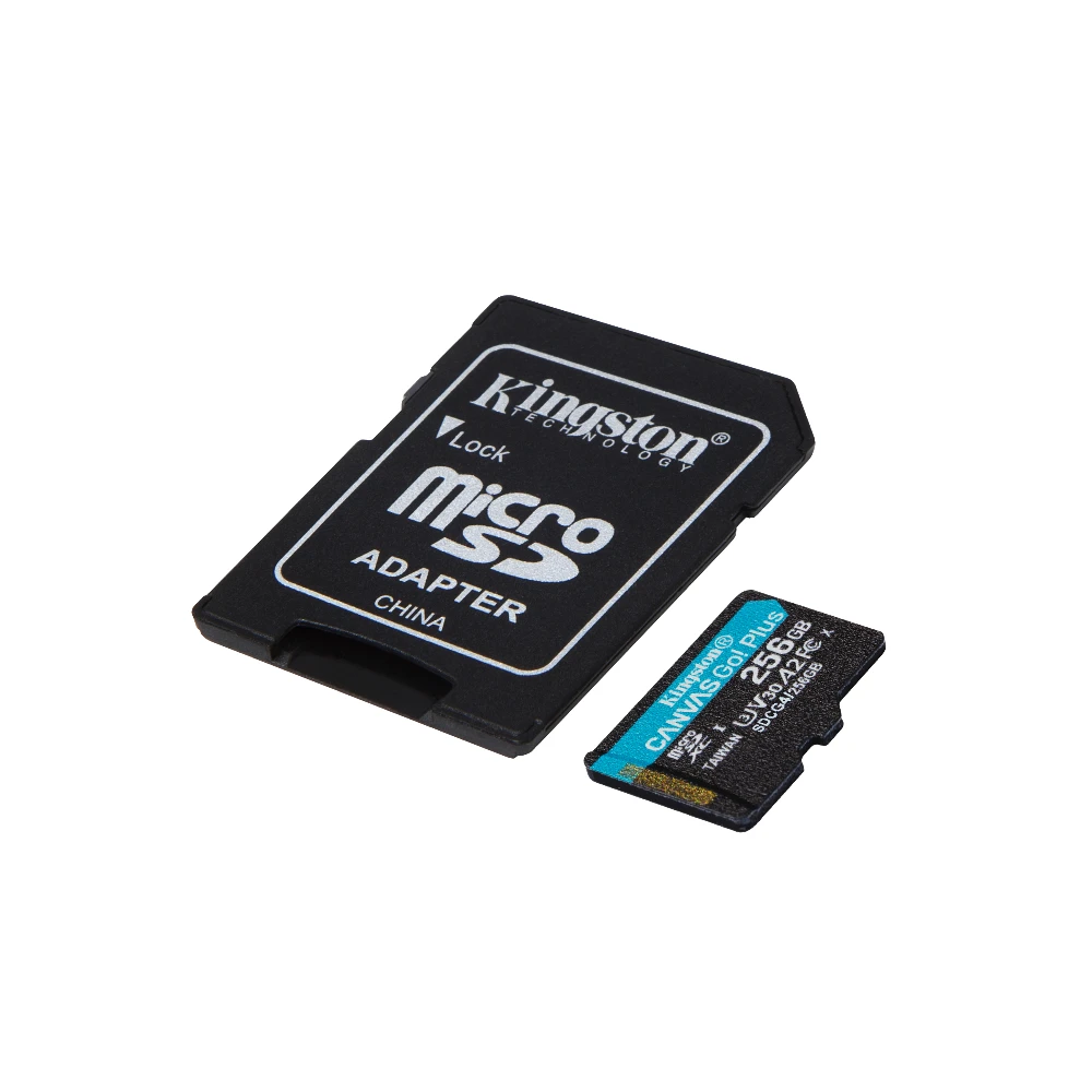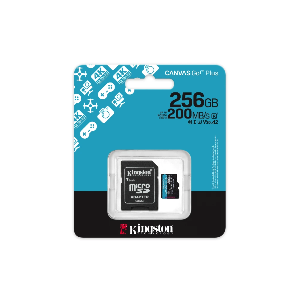 Kingston Technology 256GB microSDXC Canvas Go Plus Gen4 200MB/s A2 U3 V30 Card + Adapter. Capacity: 256 GB, Flash card type: MicroSD, Flash memory class: Class 10, Internal memory type: UHS-I, Read speed: 200 MB/s, Write speed: 160 MB/s, UHS Speed Class: Class 3 (U3), Video Speed Class: V30. Product colour: Black, Turquoise