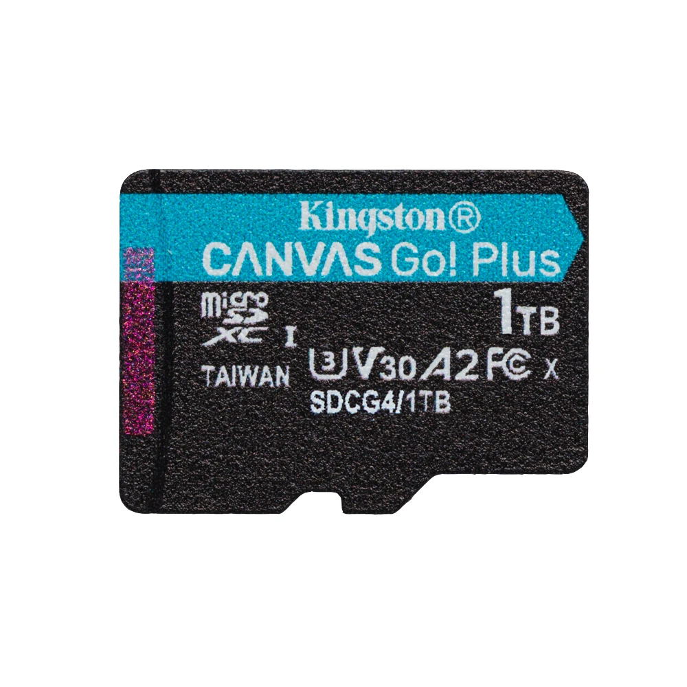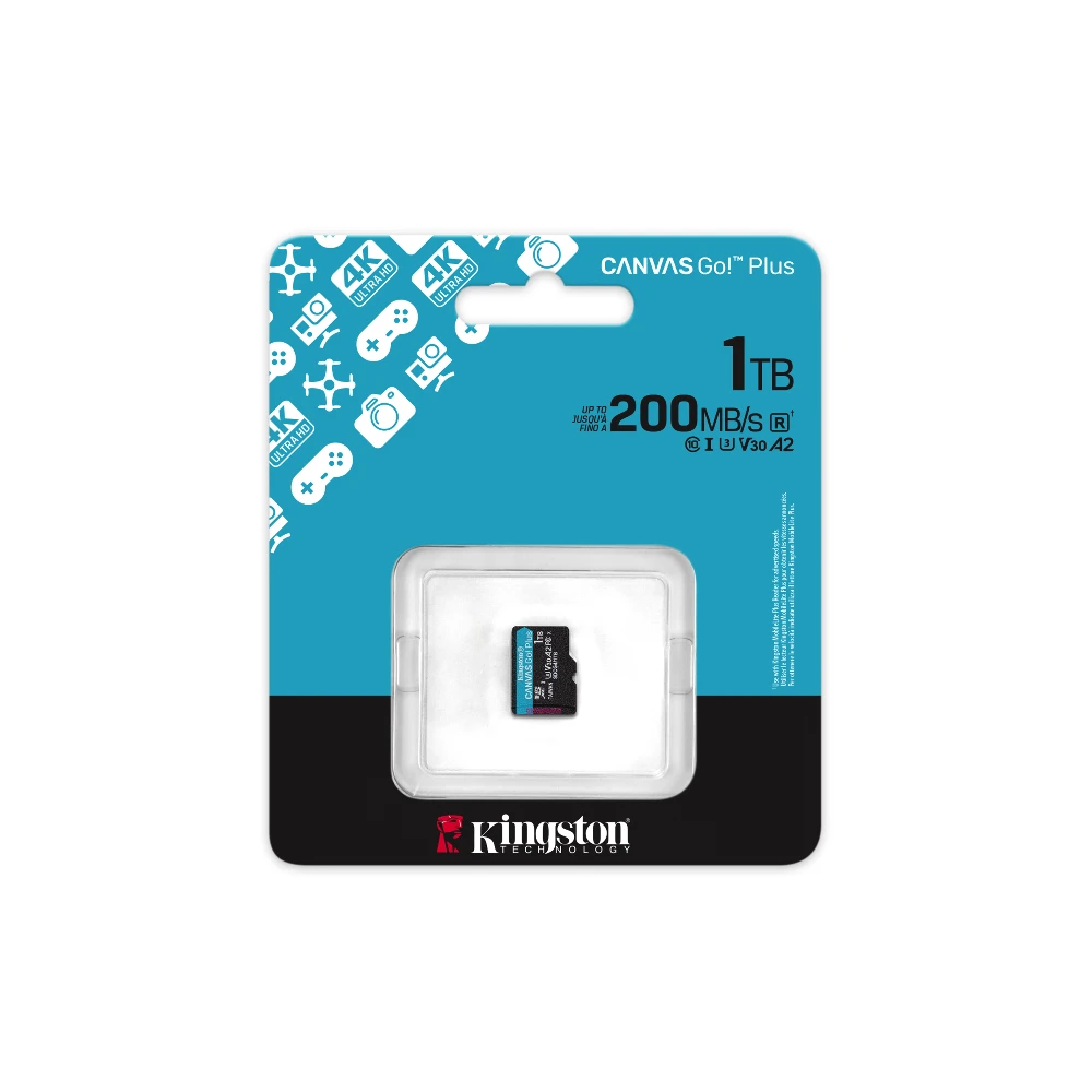 Kingston Technology 1TB microSDXC Canvas Go Plus Gen4 200R A2 U3 Single Pack w/o ADP. Capacity: 1 TB, Flash card type: MicroSD, Flash memory class: Class 10, Internal memory type: UHS-I, Read speed: 200 MB/s, Write speed: 160 MB/s, UHS Speed Class: Class 3 (U3), Video Speed Class: V30. Product colour: Black, Turquoise