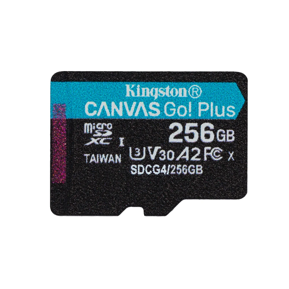 Kingston Technology 256GB microSDXC Canvas Go Plus Gen4 200R A2 U3 Single Pack w/o ADP. Capacity: 256 GB, Flash card type: MicroSD, Flash memory class: Class 10, Internal memory type: UHS-I, Read speed: 200 MB/s, Write speed: 160 MB/s, UHS Speed Class: Class 3 (U3), Video Speed Class: V30. Product colour: Black, Turquoise