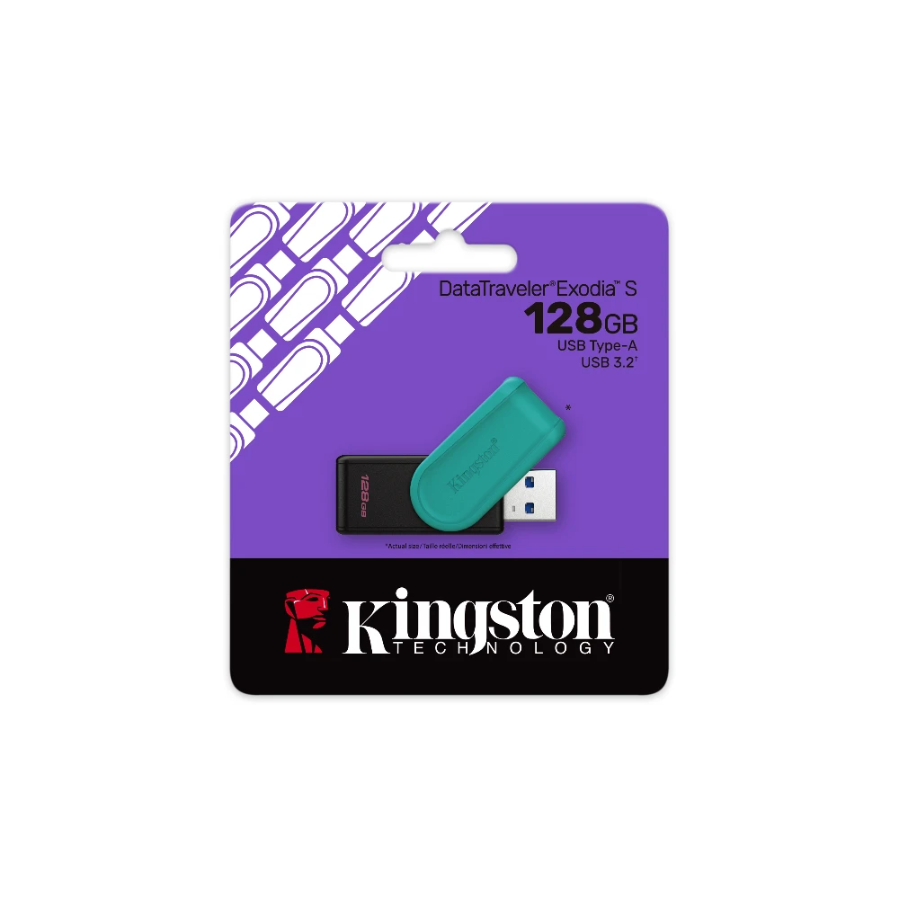 128GB Portable USB 3.2 Gen 1 DataTraveler Exodia S (Black/Turquoise) Kingston Technology DataTraveler 128GB Portable USB 3.2 Gen 1 Exodia S (Black/Turquoise). Capacity: 128 GB, Device interface: USB Type-A, USB version: 3.2 Gen 1 (3.1 Gen 1). Form factor: Swivel. Weight: 8.32 g. Product colour: Black, Turquoise with swivel cap in bold colours