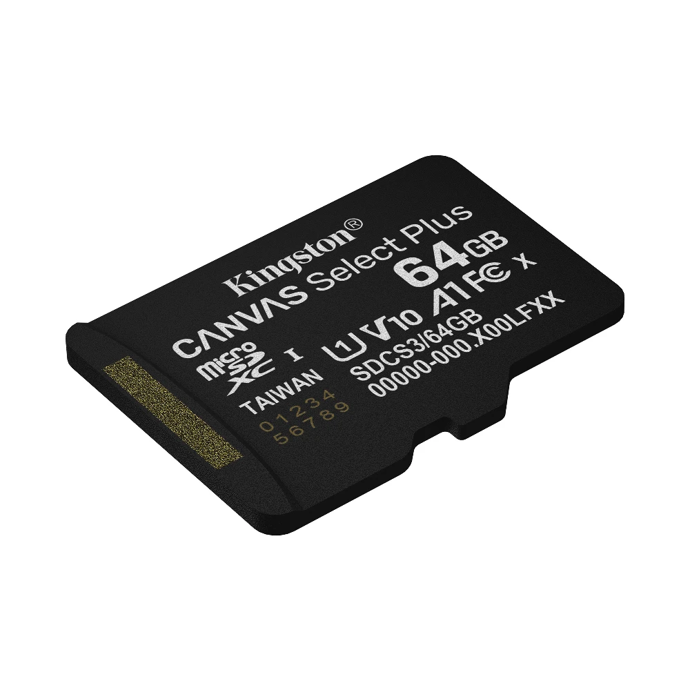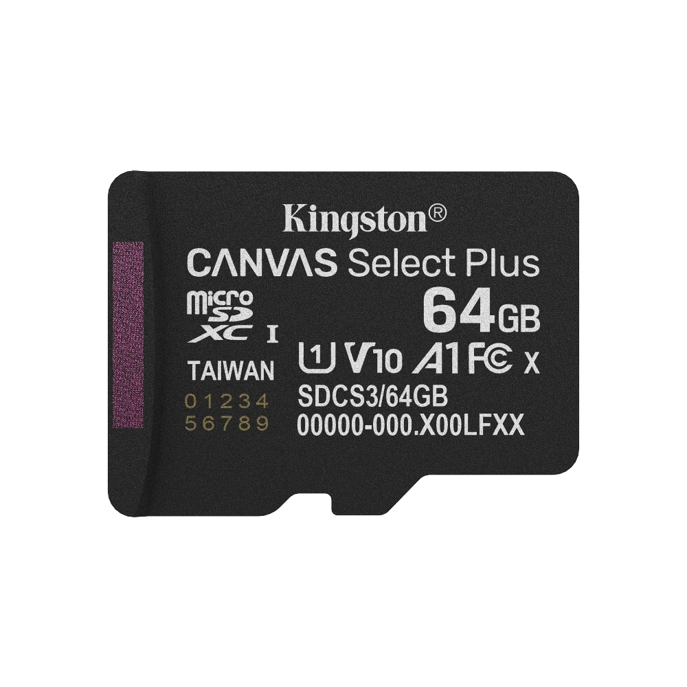 Kingston Technology 64GB micSDXC Canvas Select Plus Gen3 100R A1 Single Pack w/o ADP. Capacity: 64 GB, Flash card type: MicroSDXC, Flash memory class: Class 10, Internal memory type: UHS-I, Read speed: 100 MB/s, UHS Speed Class: Class 1 (U1), Video Speed Class: V10. Product colour: Black