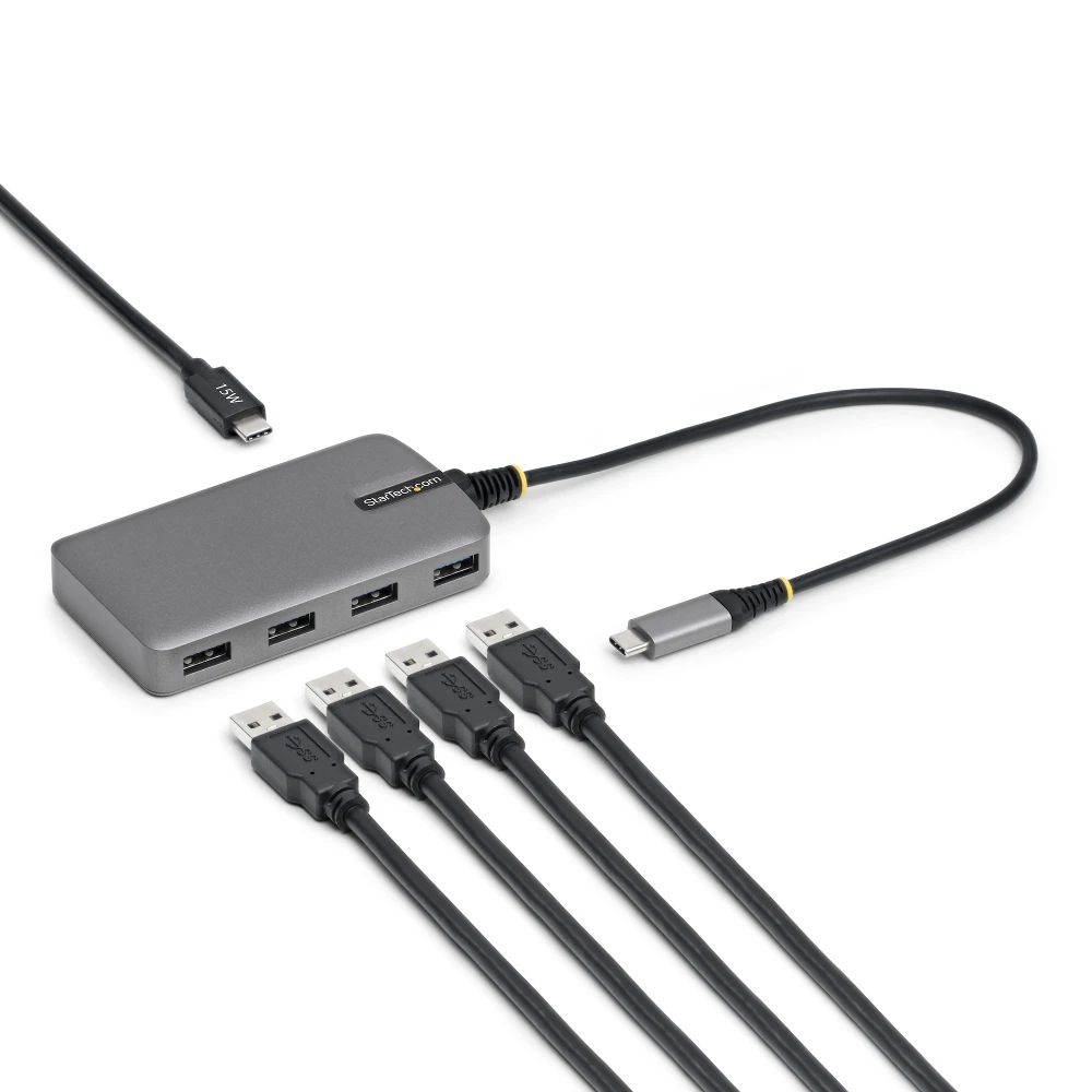 StarTech.com 4-Port USB-C Hub, 5Gbps, Bus Powered, USB C to 4x USB-A Hub with USB-C Auxiliary Power Input, 1ft/30cm Host Cable, Portable Desktop/Laptop USB Hub. Host interface: USB 3.2 Gen 1 (3.1 Gen 1) Type-C. Data transfer rate: 5000 Mbit/s, Product colour: Grey, Housing material: Plastic. Power supply type: USB. Other operating systems supported: ChromeOS. Width: 54 mm, Depth: 420 mm, Height: 16 mm
