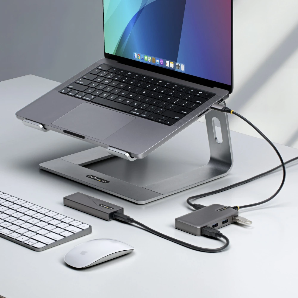 This device is OS independent, supporting all operating systems, including Windows, macOS, ChromeOS, iPadOS, and Android. The Hub is automatically detected, configured, and installed upon connection to a host computer. This ensures automatic installation and with any USB-C laptop, including Thunderbolt and USB4 computers such as Apple MacBook (Intel/M1/M2/M3/M4), Lenovo X1 Carbon, and Dell XPS. The built-in extra-long 1 ft. (30 cm) USB-C host cable ensures easy setup and reduces connector strain on 2-in-1 devices such as the Surface Pro 7, iPad Pro, HP Elite X2 and laptops on riser stands.