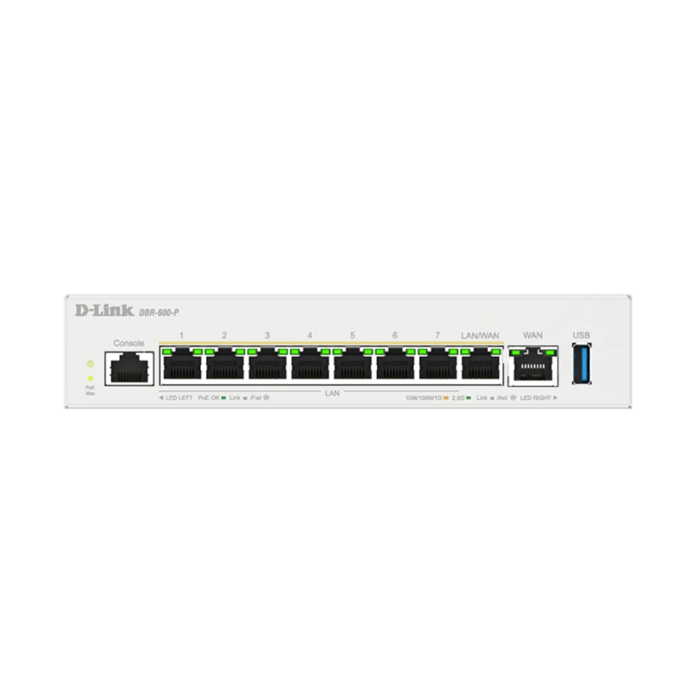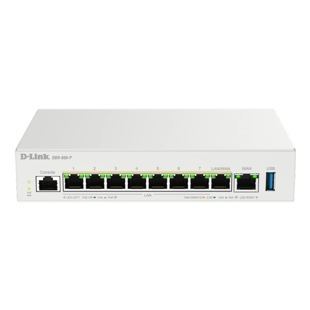 D-Link DBR-600-P/B Business PoE Router. Networking standards: IEEE 802.3at, Ethernet interface type: 2.5 Gigabit Ethernet, Ethernet LAN data rates: 10,100,1000,2500 Mbit/s. USB version: 2.0/3.2 Gen 1 (3.1 Gen 1). Security algorithms: IPSec, Firewall security: SPI. Product colour: White. Power source type: DC, Output voltage: 54 V, Output current: 2.7 A