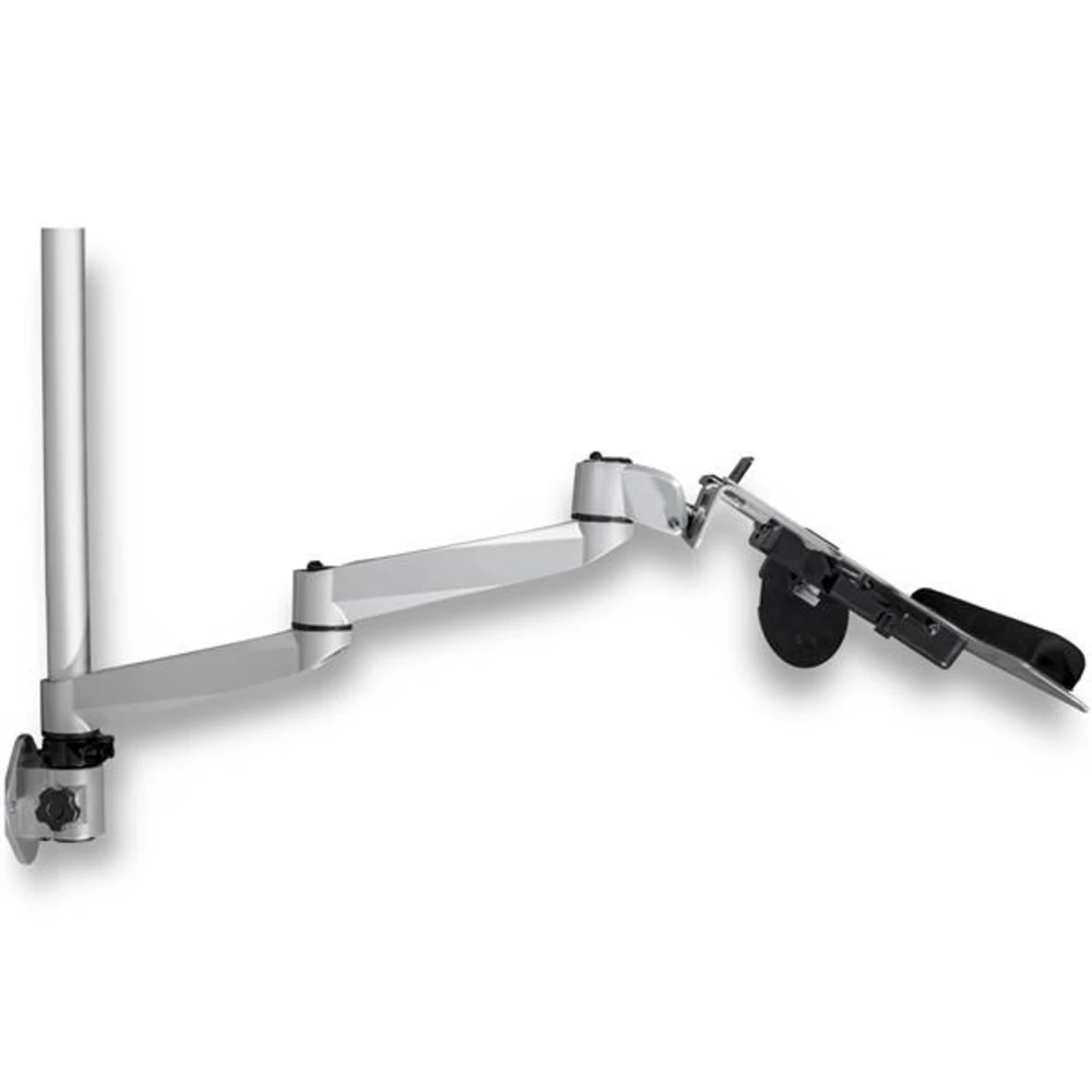 - RANGE OF MOTION: Monitor mount +90/-15° tilt, +/-120° swivel, 360° rotation; Keyboard Tray +90/-15° tilt; Base point of monitor arm, keyboard tray & cable mgmt clips can be placed along 17.5" pole