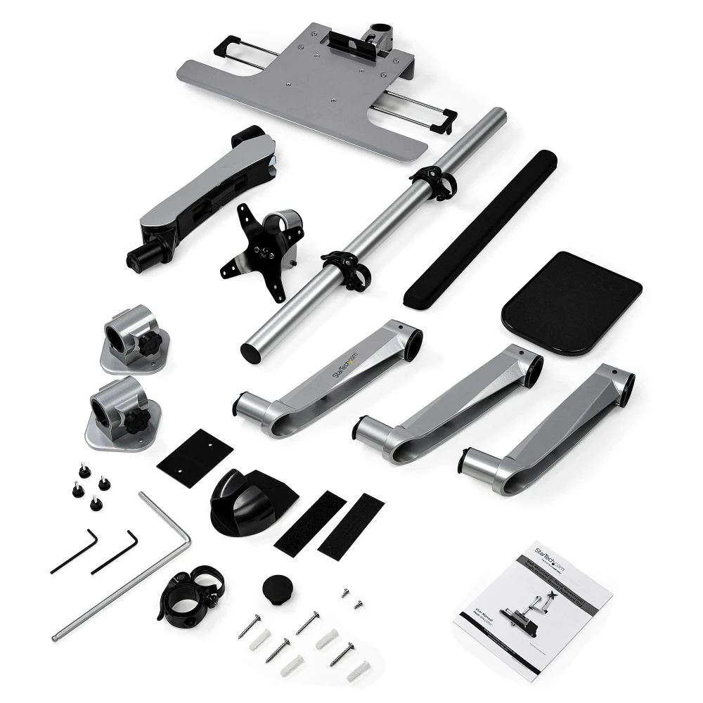 - Standing wall mount workstation with dual monitor arm for up to 30"/19.8lb VESA displays and keyboard tray - Wall-mounted foldable sit-stand computer desk | 4.75" profile | Articulating monitor arm extends 25" and stable keyboard tray 31" from wall; Secure keyboard w/adhesive strip; Mouse holder - Ergonomic workstation with adjustable monitor arms +90/-15° tilt +/-120° swivel | Cable Management | 17.5" Pole - One-touch height adjustable monitor arm - Toolless assembly - For office/healthcare
