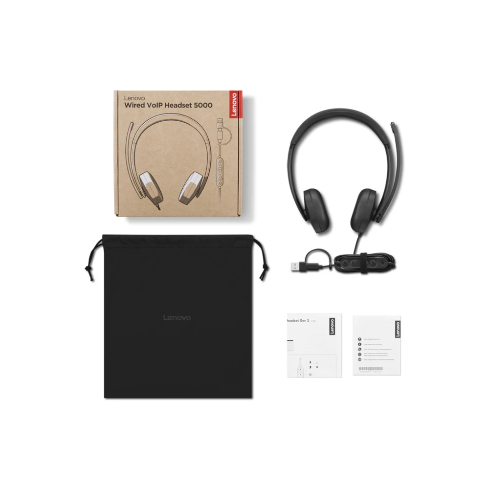 Lenovo VoIP Headset 5000. Product type: Headset. Connectivity technology: Wired. Recommended usage: Office/Call center. Headphone frequency: 20 - 20000 Hz. Cable length: 1.9 m. Weight: 144 g. Product colour: Black