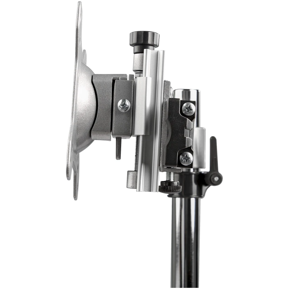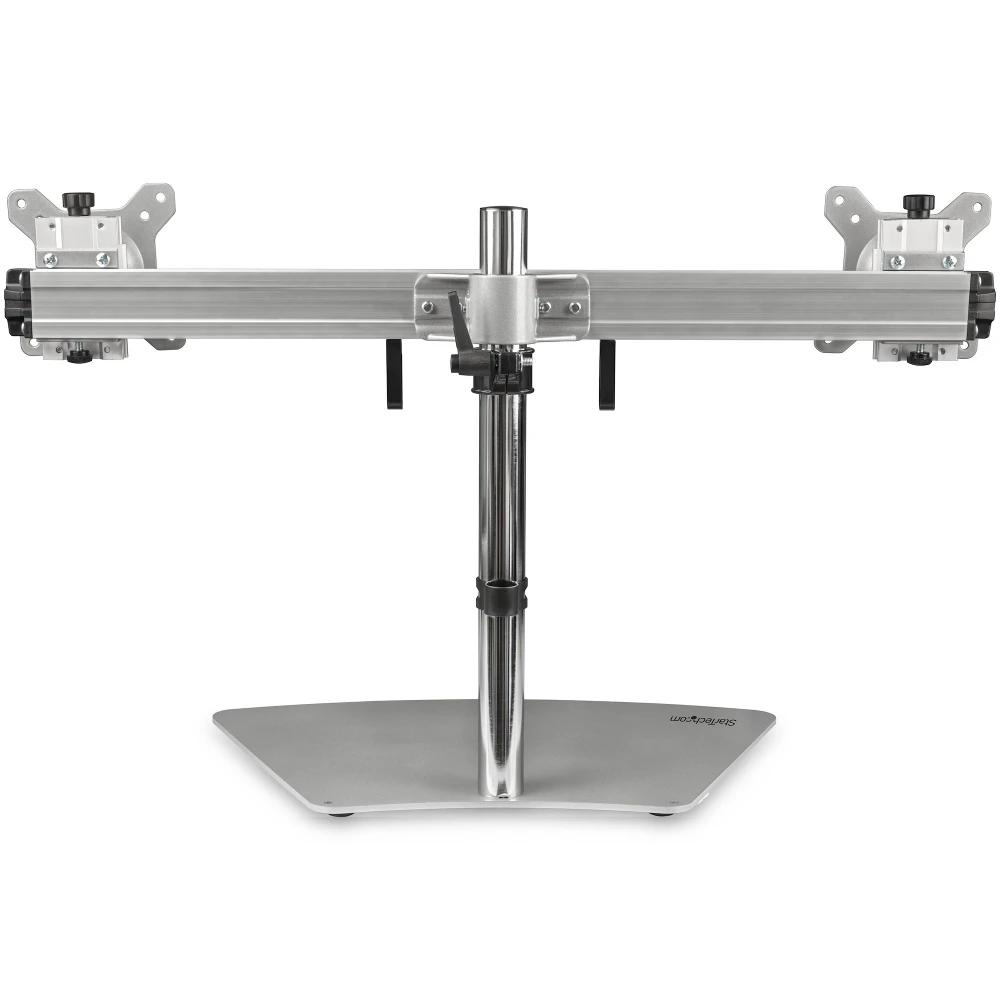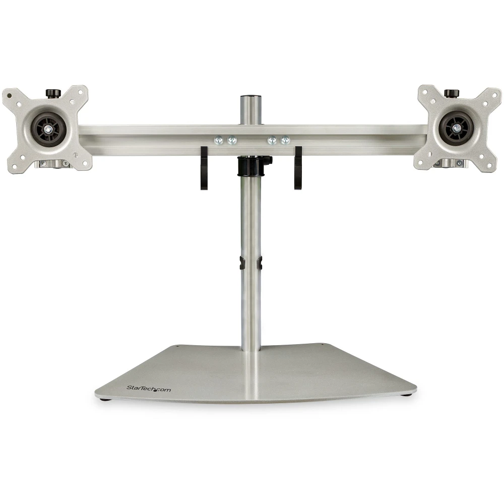 StarTech.com Dual Monitor Stand - Ergonomic Free Standing Dual Monitor Desktop Stand for two 24" VESA Mount Displays - Synchronized Height Adjustable - Double Monitor Pole Mount - Silver. Mounting: Freestanding, Maximum weight capacity: 8 kg, Maximum screen size: 61 cm (24"), Minimum VESA mount: 75 x 75 mm, Maximum VESA mount: 100 x 100 mm. Height adjustment, Tilt angle range: -15 - 15°. Product colour: Stainless steel