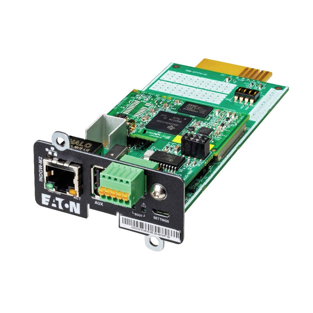 The Eaton Industrial Gateway Card (INDGW-M2) combines the features of an SNMP agent, HTTP/web server and a Modbus card to facilitate remote monitoring of your UPS system through any Building Management System. Enjoy the freedom to customize and schedule actions, like shutdown protocols and load shedding, and receive immediate notifications during power events, without having to be onsite.