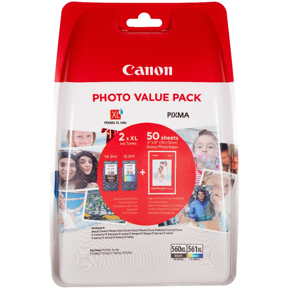 Canon PG-560XL Black and CL-561XL Colour Ink Cartridge + Photo Paper Value Pack. Cartridge capacity: High (XL) Yield, Black ink volume: 12.2 ml, Supply type: Multi pack, Colour ink page yield: 300 pages, Colour ink volume: 14.3 ml, Printing colours: Black, Cyan, Magenta, Yellow, Quantity per pack: 2 pc(s), Black ink page yield: 400 pages