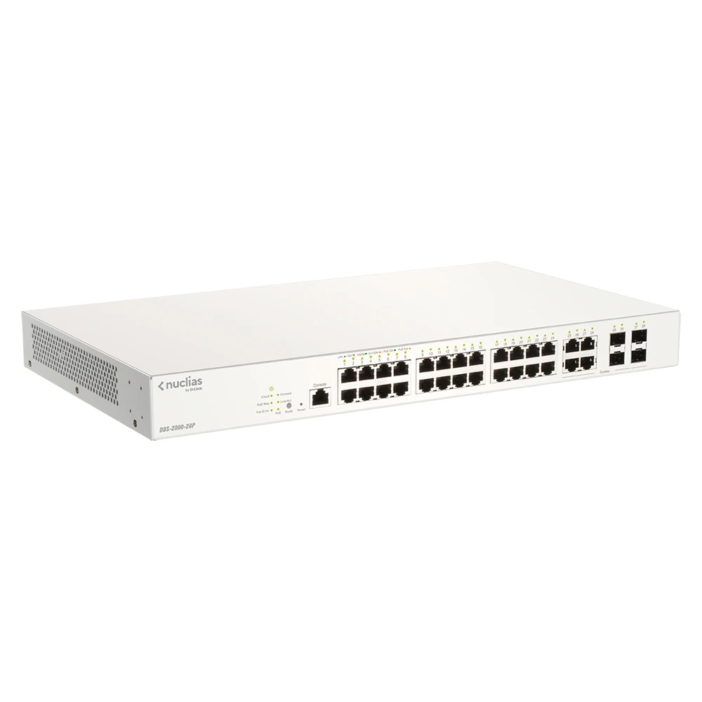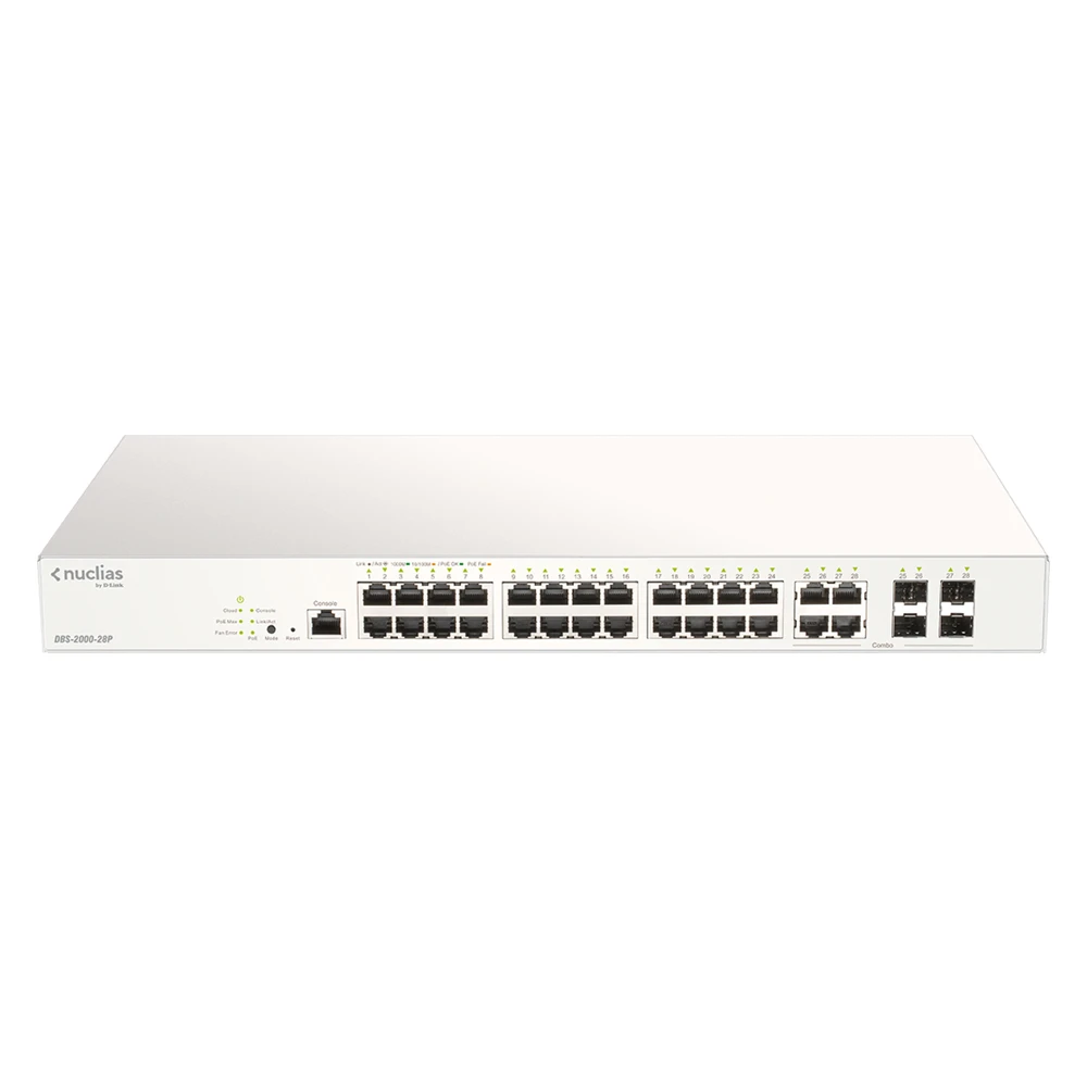 DBS-2000-28P, 56 Gbps, 41.7 Mpps, 24x 1G PoE RJ-45, 4x 1G SFP/RJ-45, 500MHz, 256MB DDR3, 440x250x44 mm