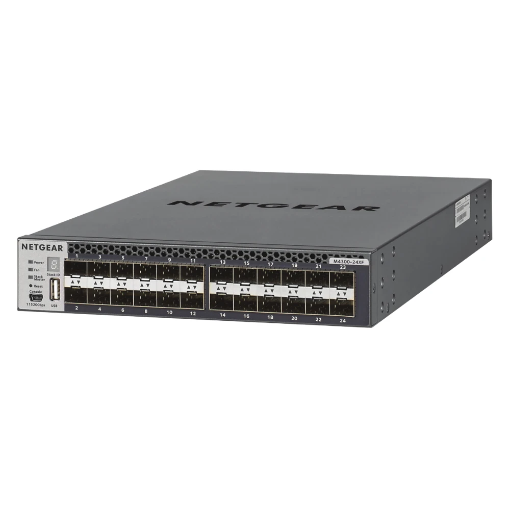 NETGEAR M4300-24XF. Switch type: Managed, Switch layer: L3. USB 2.0 ports quantity: 1, Console port: RJ-45/Mini-USB. Full duplex. MAC address table: 16000 entries, Switching capacity: 480 Gbit/s. Networking standards: IEEE 802.1AX, IEEE 802.1D, IEEE 802.1Q, IEEE 802.1Qbb, IEEE 802.1ab, IEEE 802.1p, IEEE 802.1s,.... Rack mounting, Form factor: 1U