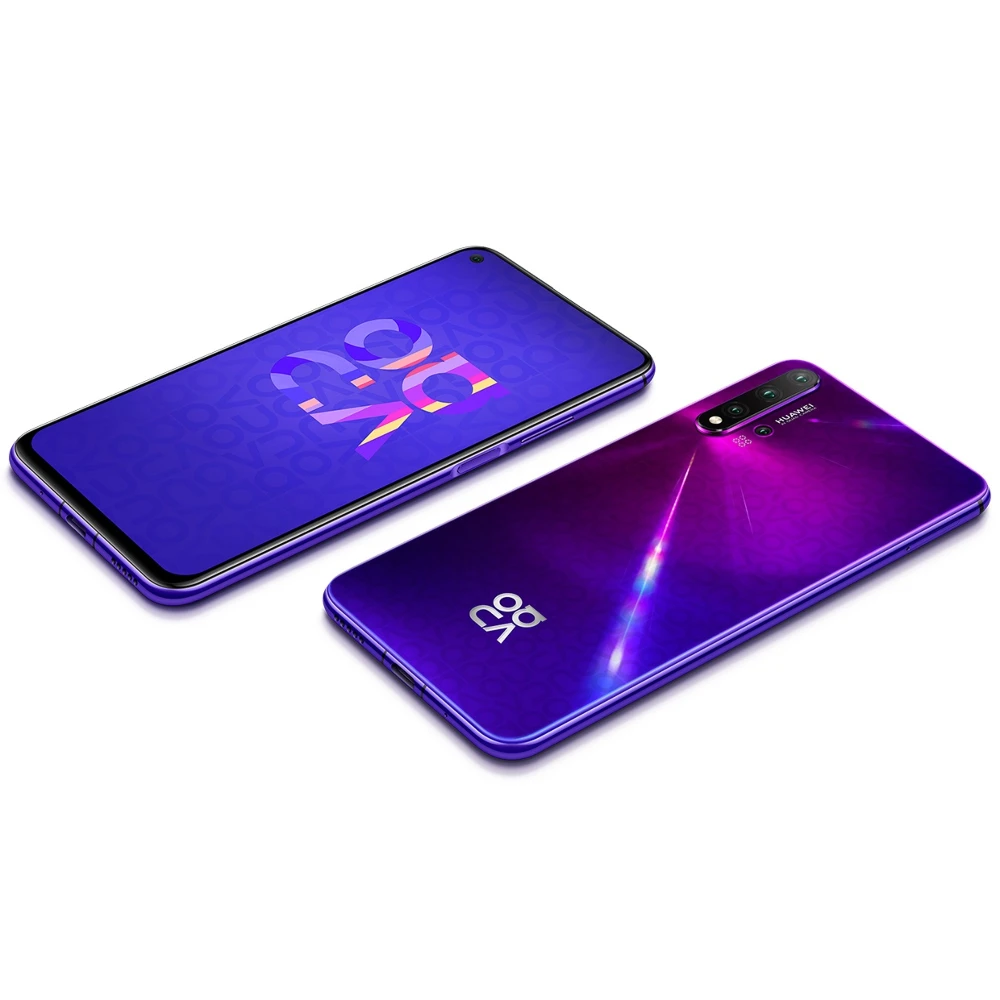 Huawei Nova 5T. Display diagonal: 15.9 cm (6.26"), Display resolution: 2340 x 1080 pixels. Processor frequency: 2.6 GHz, Processor family: Hi-Silicon, Processor model: Kirin 980. RAM capacity: 6 GB, Internal storage capacity: 128 GB. Rear camera resolution (numeric): 48 MP, Rear camera type: Quad camera. SIM card capability: Dual SIM. Operating system installed: Android 9.0. Battery capacity: 3750 mAh. Product colour: Purple. Weight: 174 g