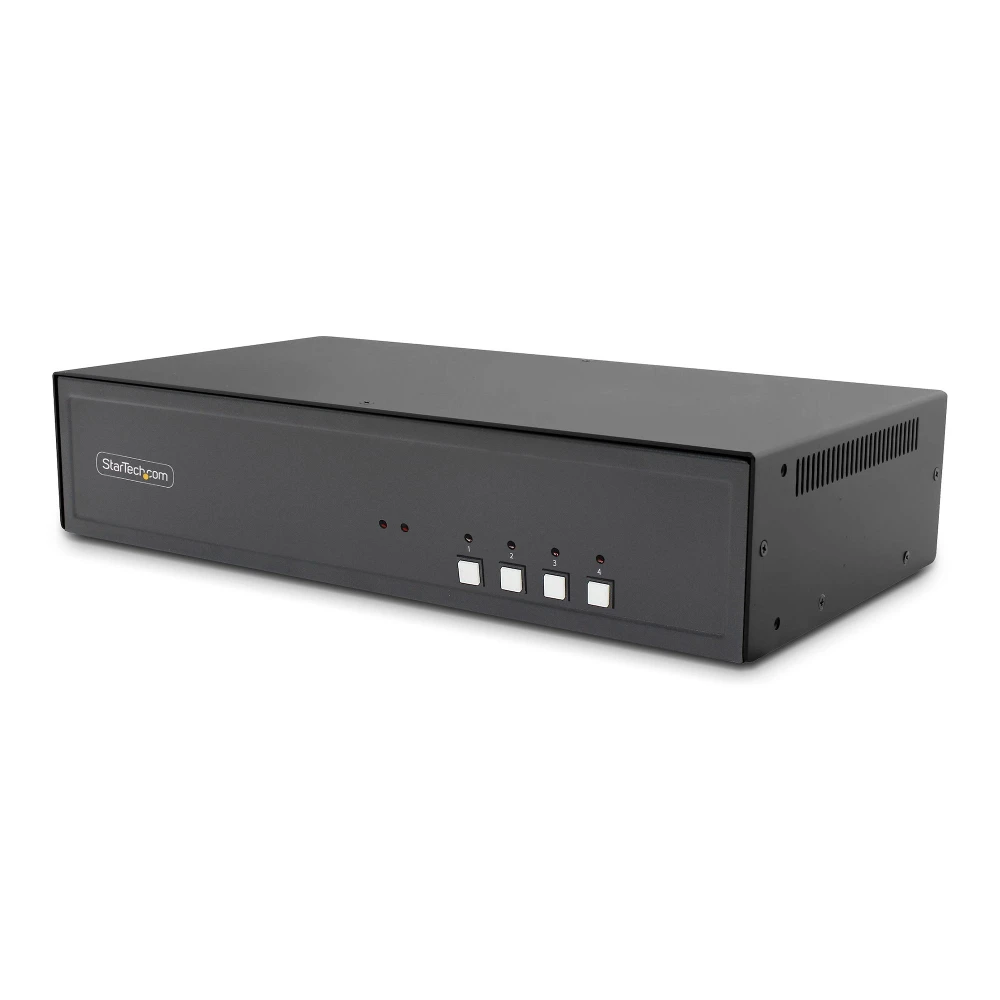 StarTech.com Secure 4-Port Quad-Monitor KVM Switch, 2x DP In to 4x HDMI Out, 4K 30Hz, NIAP 4.0 Desktop KVM, Metal Housing, CAC Port, Made in the USA. Keyboard port type: USB, Mouse port type: USB, Video port type: DisplayPort. HD type: 4K Ultra HD, Maximum resolution: 3840 x 2160 pixels, Maximum refresh rate: 30 Hz. Product colour: Black, Housing material: Metal, Maximum cable length: 6 m. Power source: DC. Compliance certificates: Federal Communications Commission (FCC), RoHS, Trade Agreements Act (TAA)