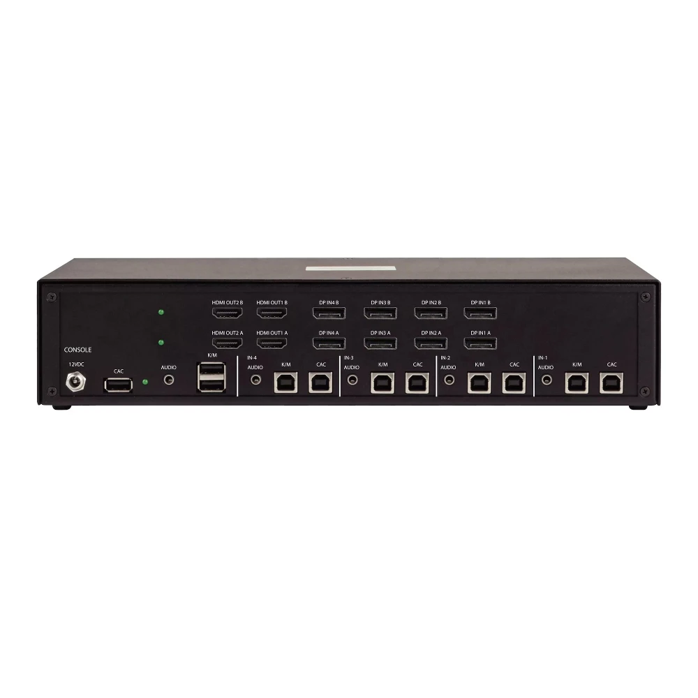 - Securely control four DP desktops or servers from one mouse / keyboard and four 4K 30Hz HDMI monitors - Status LEDs for user console ports / CAC port / port selection - NIAP 4.0 Certified prevents data leaks / isolates systems / has no internal memory or storage - Dedicated and Configurable Common Access Card Port enabling secure smart card login - Anti-Tamper switches detect physical intrusion attempts which disable all functionality and trigger visual and audible alerts - Built in the USA