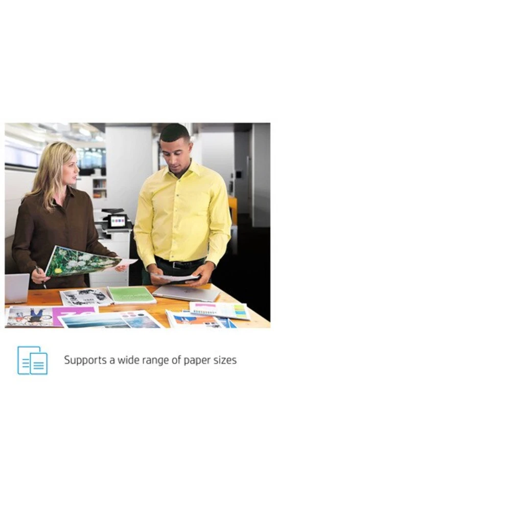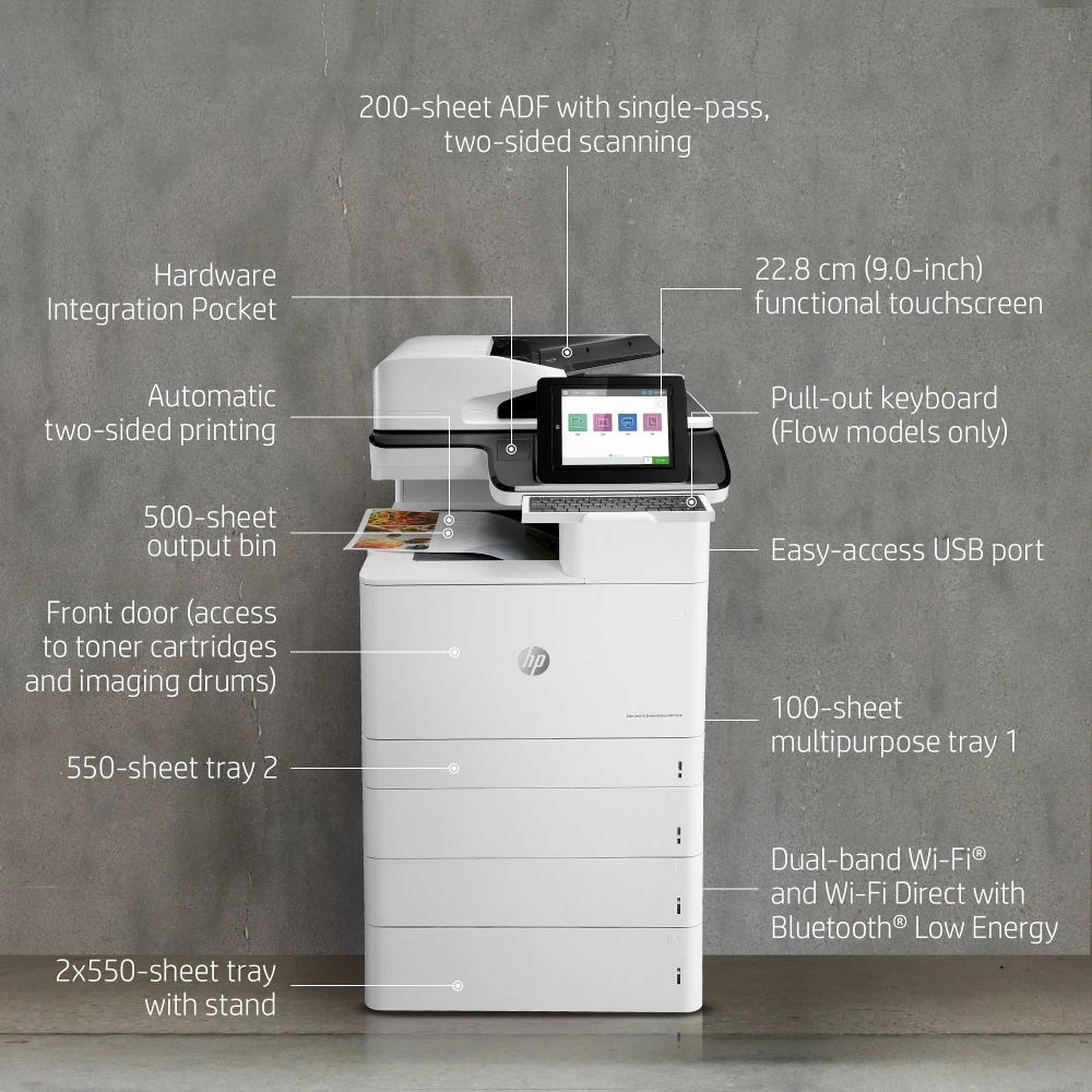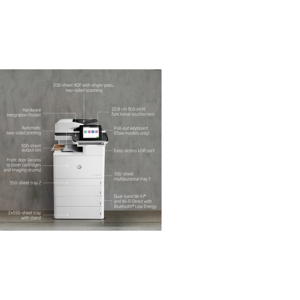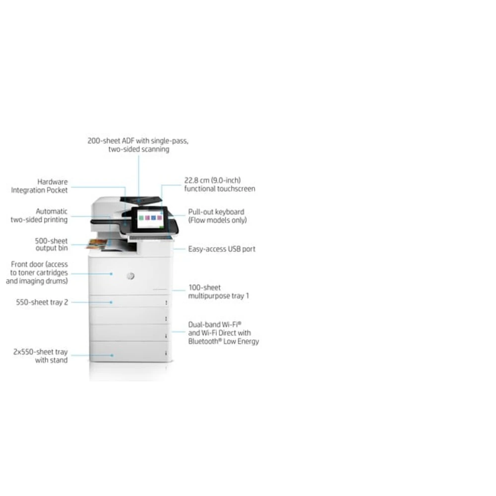HP Color LaserJet Enterprise Flow MFP M776z, Print, copy, scan and fax, Front-facing USB printing. Print technology: Laser, Printing: Colour printing, Maximum resolution: 1200 x 1200 DPI, Print speed (colour, normal quality, A4/US Letter): 46 ppm. Copying: Colour copying, Maximum copy resolution: 600 x 600 DPI. Scanning: Colour scanning, Optical scanning resolution: 600 x 600 DPI. Faxing: Colour faxing. Duplex functions: Print, Copy, Scan. Maximum ISO A-series paper size: A3. Wi-Fi. Direct printing. Product colour: Black, White