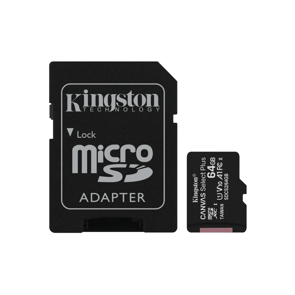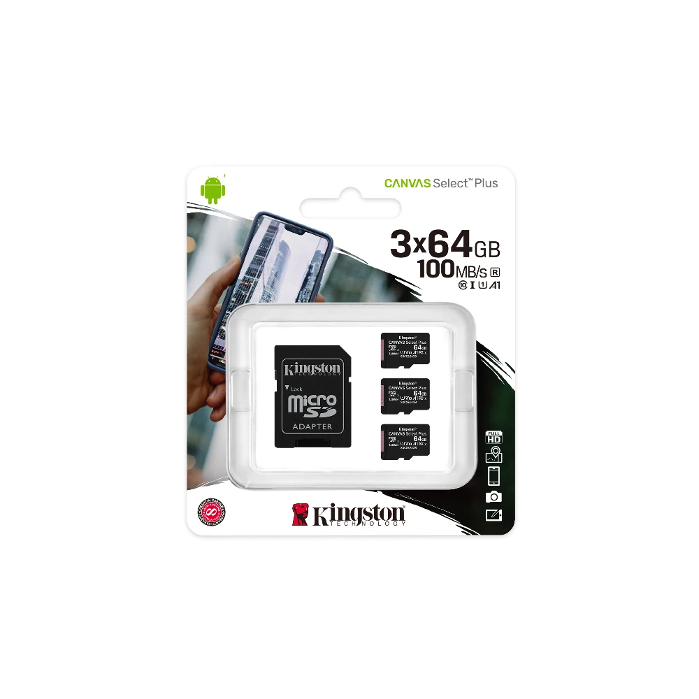 Kingston Technology 64GB micSDXC Canvas Select Plus 100R A1 C10 Three Pack + Single ADP. Capacity: 64 GB, Flash card type: MicroSDXC, Flash memory class: Class 10, Internal memory type: UHS-I, Read speed: 100 MB/s, UHS Speed Class: Class 1 (U1), Video Speed Class: V10. Protection features: Shock resistant, Vibration proof, X-ray proof, Product colour: Black