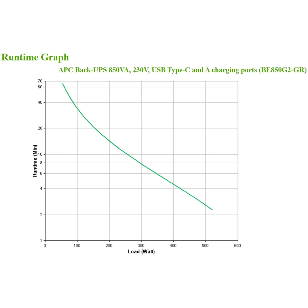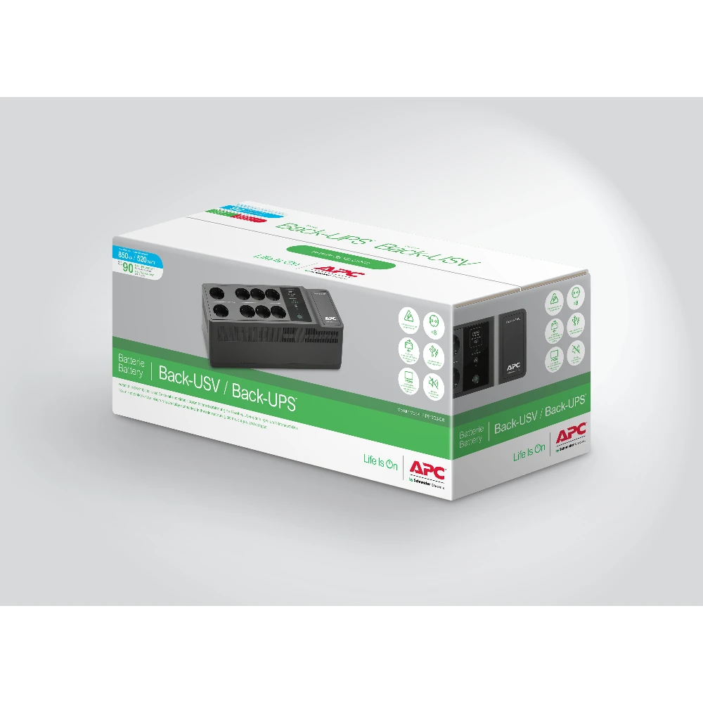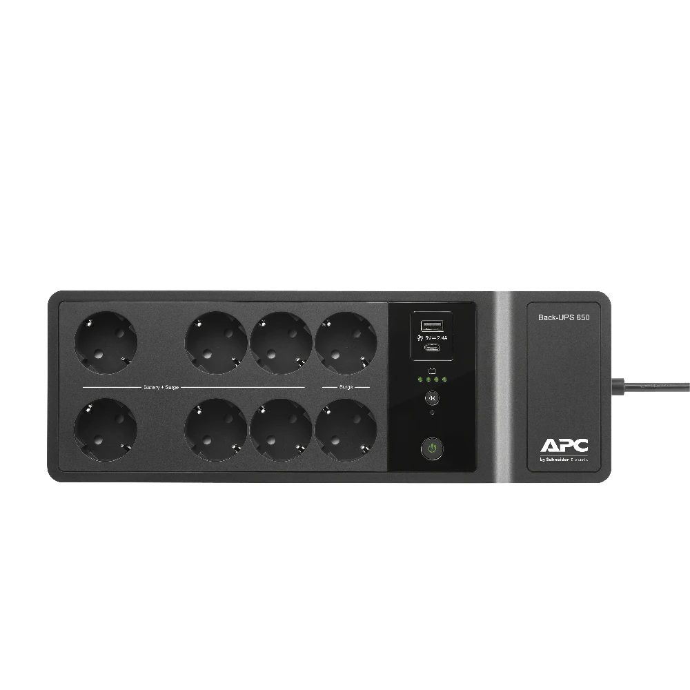 APC Back-UPS 850VA, 230V, USB Type-C, USB Type-A APC Back-UPS BE850G2-GR - Emergency power supply 8x socket, 850VA, 2 USB chargers, 1 USB data port. UPS topology: Standby (Offline), Output power capacity: 0.85 kVA, Output power: 520 W. AC outlet types: Type F, Power plug: Type F, AC outlets quantity: 8 AC outlet(s). Battery technology: Sealed Lead Acid (VRLA), Battery capacity: 93 Ah, Typical backup time at full load: 2 min. Form factor: Compact, Product colour: Black, Cable length: 1.83 m. Compliance certificates: RoHS, Certification: REACH, CE, EAC Safety-agency approved