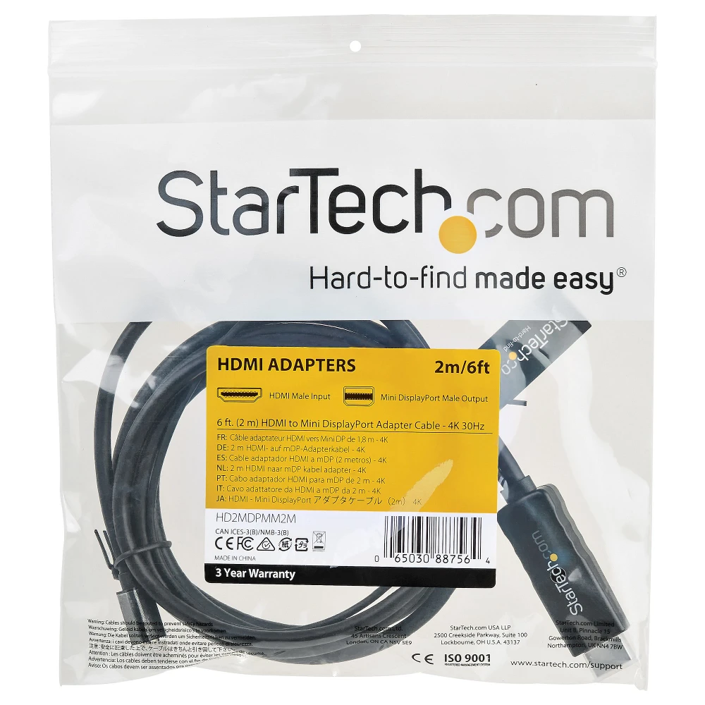 StarTech.com 6ft (2m) HDMI to Mini DisplayPort Cable 4K 30Hz - Active HDMI to mDP Adapter Converter Cable with Audio - USB Powered - Mac & Windows - Male to Male Video Adapter Cable (HD2MDPMM2M) StarTech.com 6ft (2m) HDMI to Mini DisplayPort Cable 4K 30Hz - Active HDMI to mDP Adapter Converter Cable with Audio - USB Powered - Mac & Windows - Male to Male Video Adapter Cable. Cable length: 2 m, Connector 1: HDMI Type A (Standard), Connector 2: Mini DisplayPort. Compliance certificates: CE, RoHS. Weight: 103 g. Package width: 200 mm, Package depth: 220 mm, Package weight: 115 g. Quantity per pack: 1 pc(s) - HDMI 1.4 to Mini DisplayPort 1.2 active video adapter cable | 4K 30Hz | 7.1ch Audio | HDCP 1.4 | 1440p and 1080p - 6.6ft HDMI to mDP male to male converter cable minimizes signal loss/potential failure points | built-in 16" USB power cable - Works w/ any HDMI device incl laptops/desktops/tablets/Chromebooks/2-in-1s/media players - Tested w/ range of mini DP monitors incl Dell UltraSharp/Apple LED Cinema Display/LG/HP/Asus/Acer/ViewSonic - Driverless setup Windows/macOS/Chrome OS/Linux/Android Active Video Converter | USB-Powered | Mac & Windows®