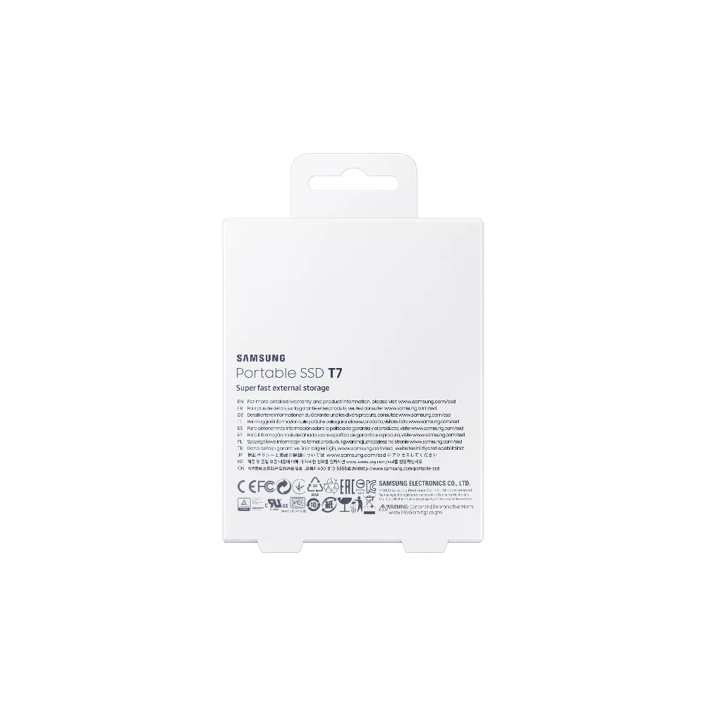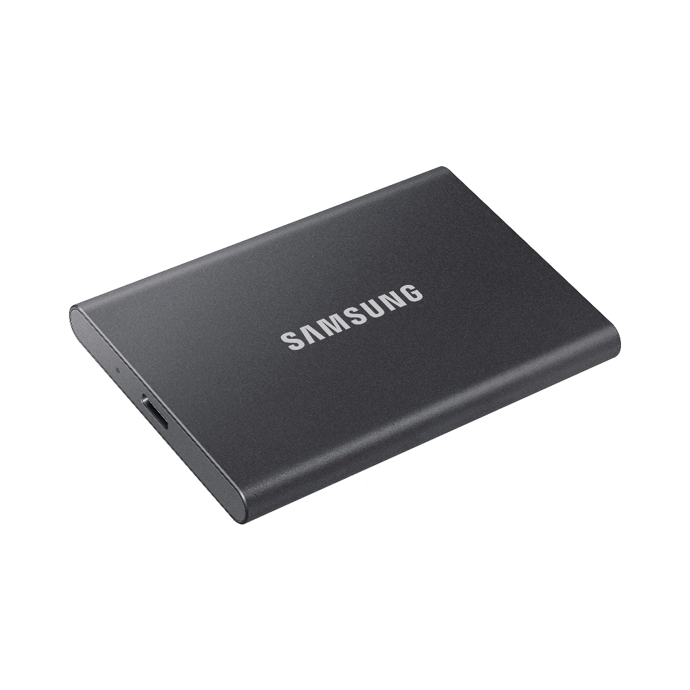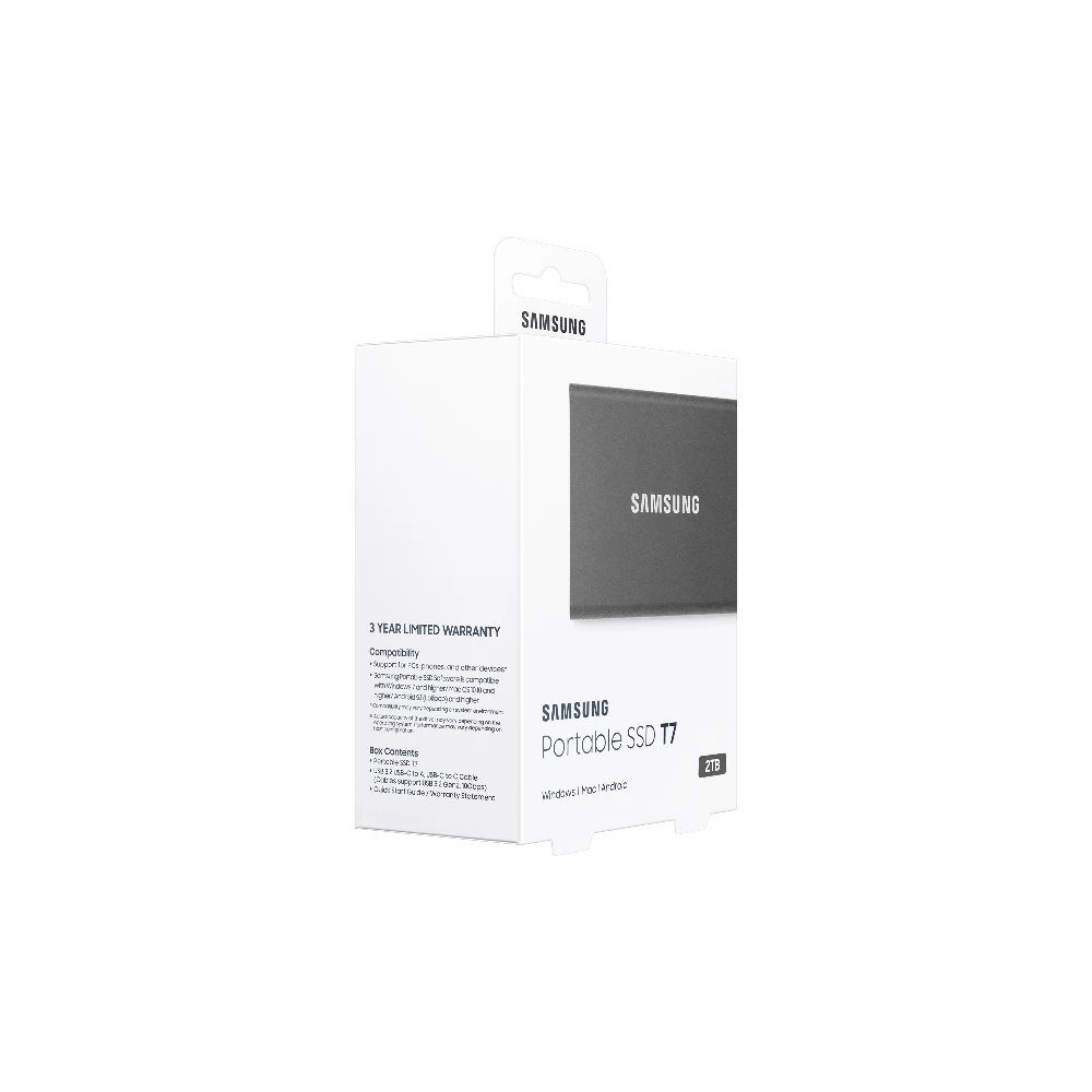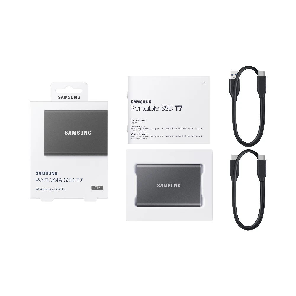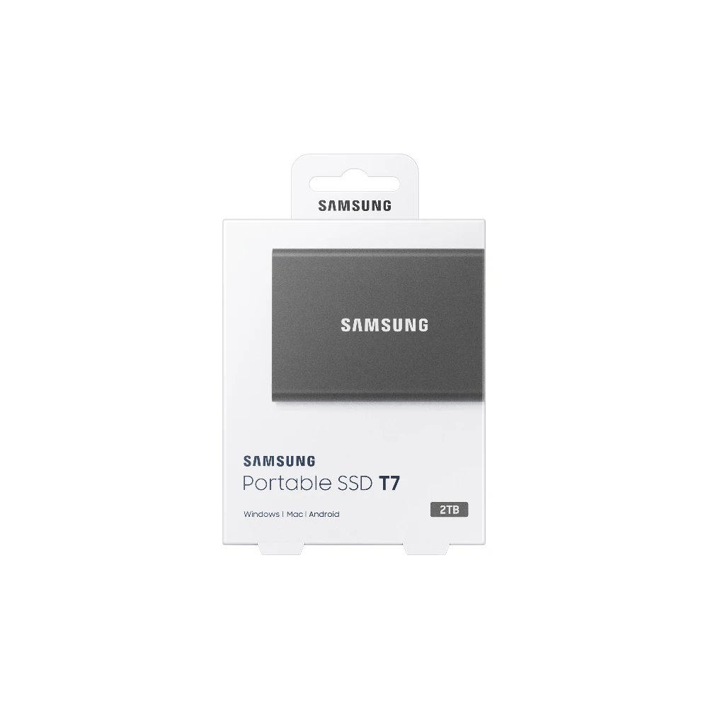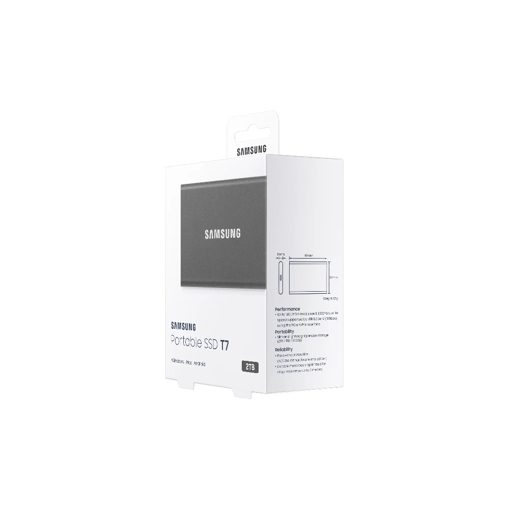 Samsung Portable SSD T7. SSD capacity: 2 TB. USB connector: USB Type-C, USB version: 3.2 Gen 2 (3.1 Gen 2). Read speed: 1050 MB/s, Write speed: 1000 MB/s. Password protection. Product colour: Grey