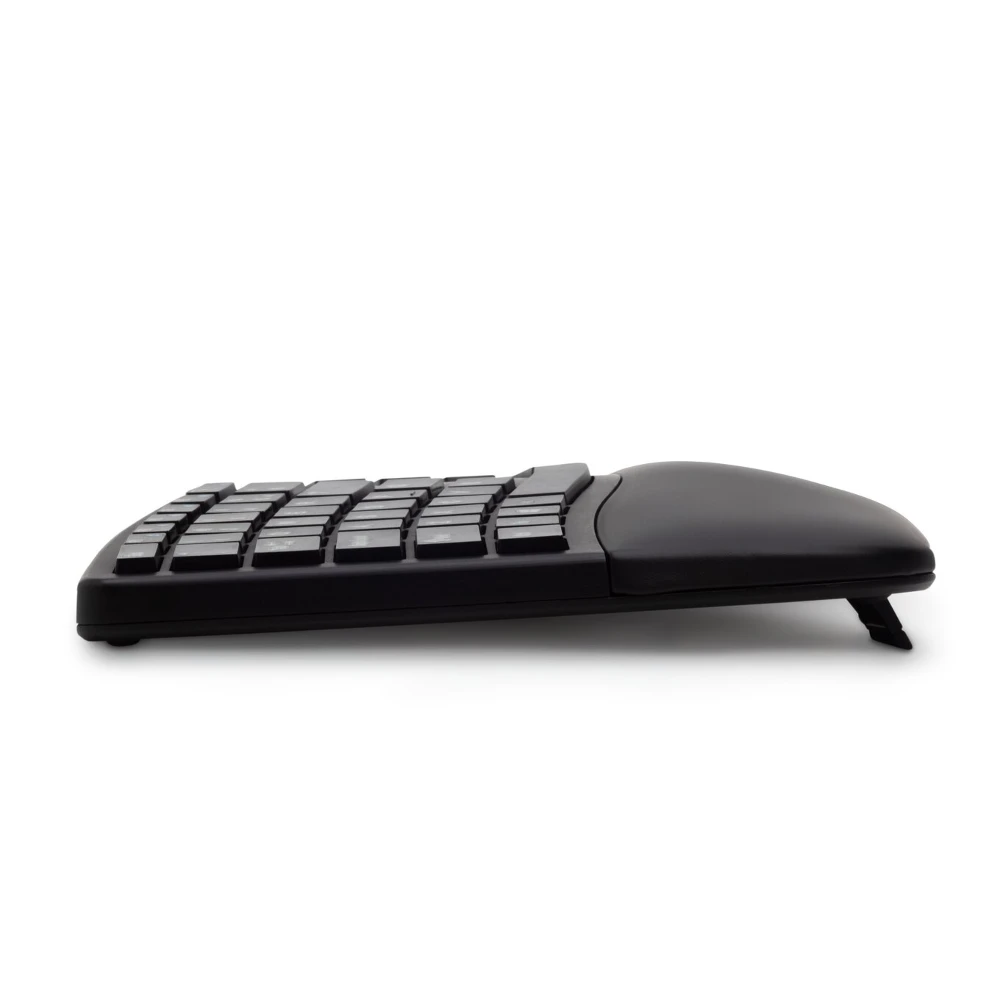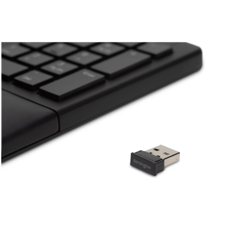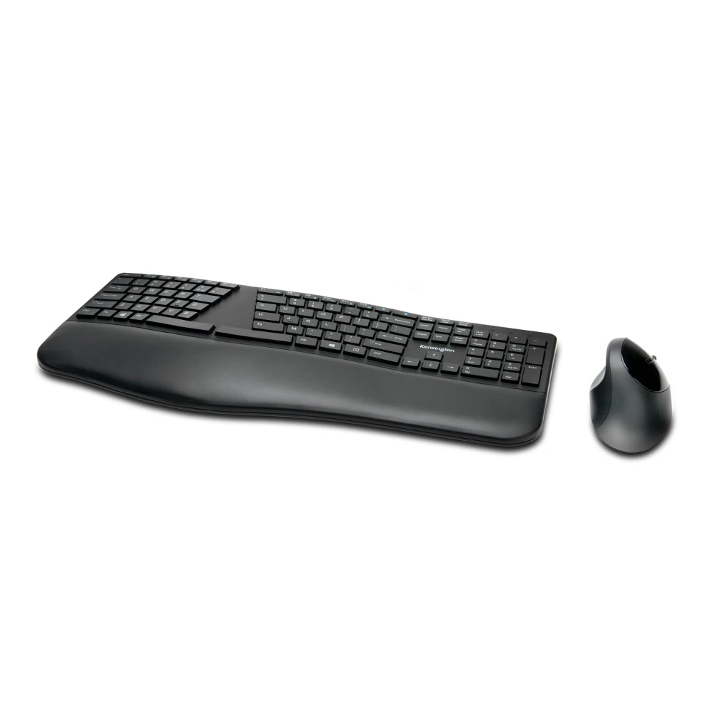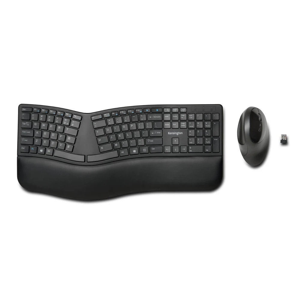 ProFit Ergo Wireless Desktop Set IT Kensington ProFit Ergo Wireless Desktop Set IT. Keyboard form factor: Full-size (100%). Keyboard style: Curved. Connectivity technology: Wireless, Device interface: RF Wireless + Bluetooth, Keyboard layout: QWERTY. Wrist rest. Recommended usage: Universal. Product colour: Black. Mouse included With a split & sloped keyboard with adjustable reverse tilt, built-in wrist support and neutral grip, the ergonomist-approved Pro Fit® Ergo Wireless Keyboard and Mouse positions your hands for improved comfort. Features include dual wireless (2.4GHz and Bluetooth 4.0 LE) with 128-bit AES encryption, quiet typing and clicking, spill-proof keys, F-keys for shortcuts, caps lock, numbers lock and scroll lock, low battery indicator lights, a five-button (including forward and back) mouse, three-mode power-saving switches and a replaceable receiver*. * In the event the receiver is lost or damaged, simply purchase a new one, pair it with your mouse and you’re ready.