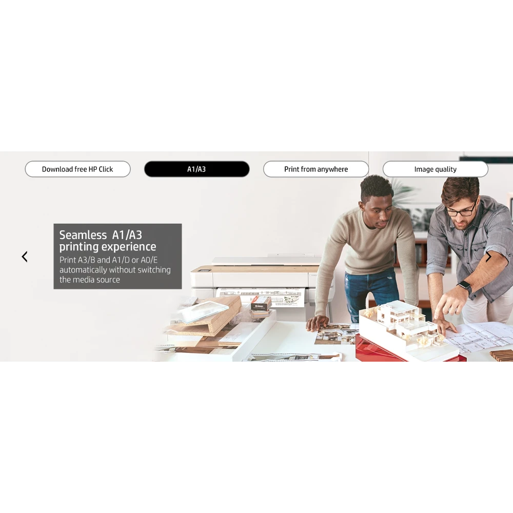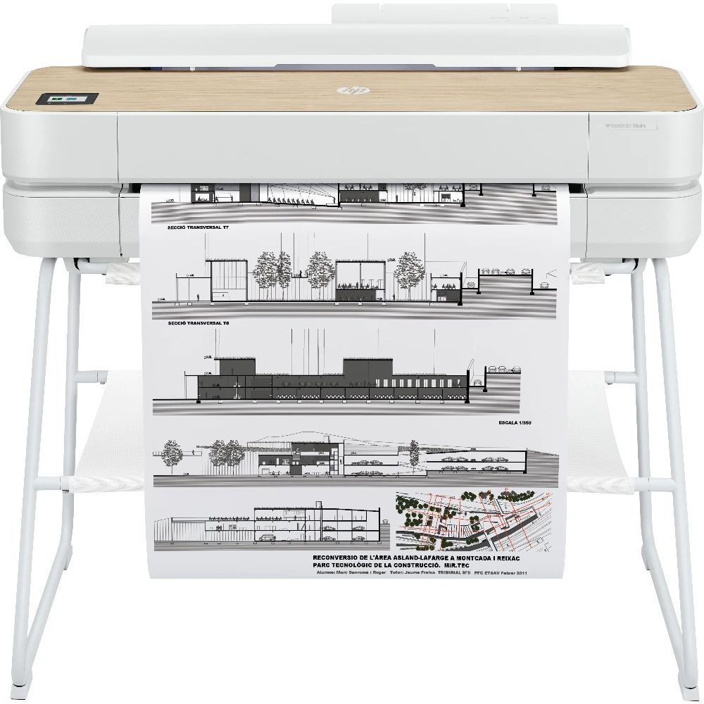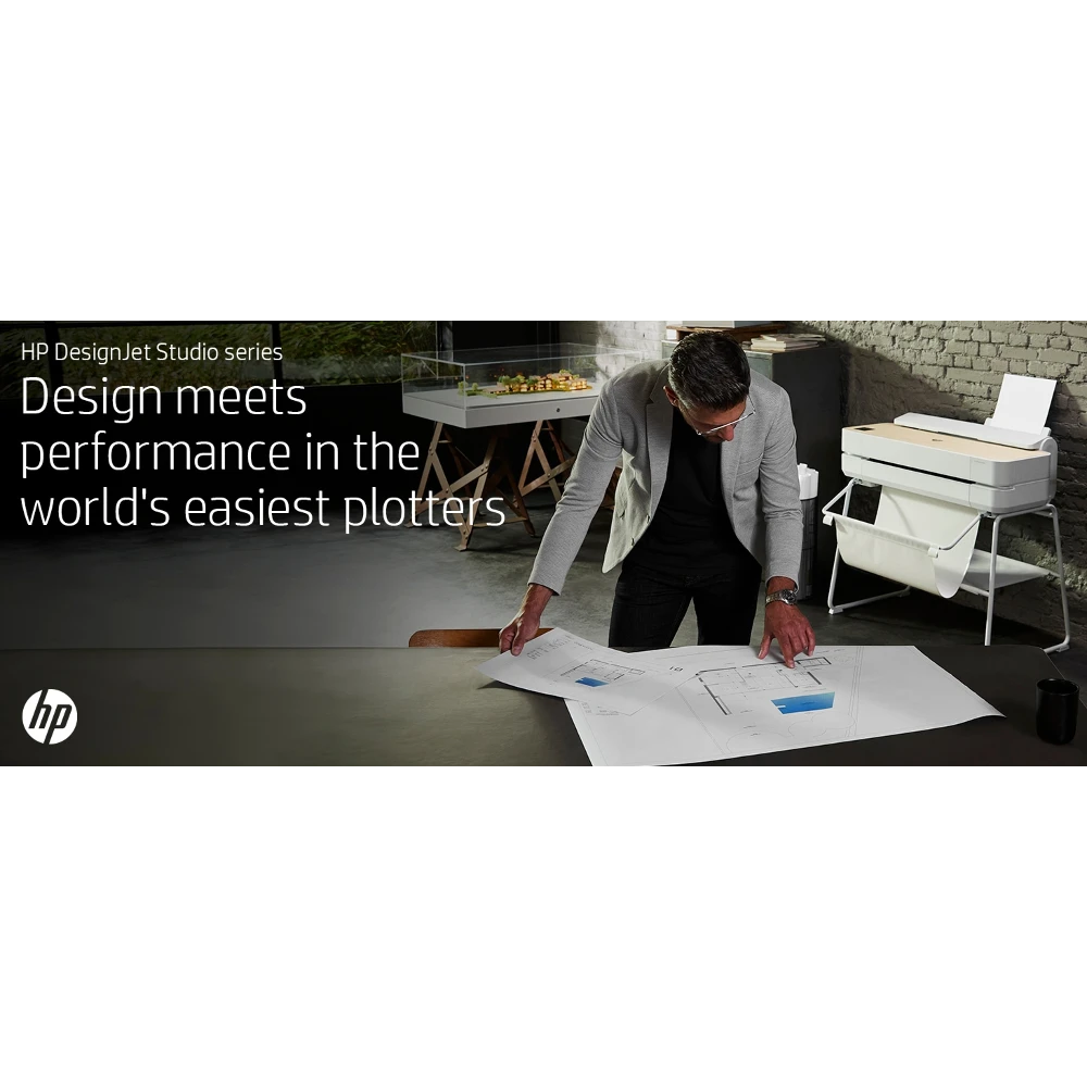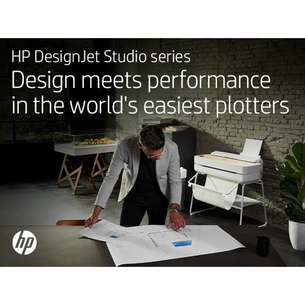 DesignJet Studio 24-in Printer HP Designjet Studio 24-in Printer. Print technology: Thermal inkjet, Maximum resolution: 2400 x 1200 DPI, Page description languages: HP-GL/2, HP-RTL, URF, JPEG, CALS G4. Maximum print size: 610 x 1897 mm, Paper tray media types: Bond paper, Coated paper, Glossy paper, Heavy paper, Matte paper, Photo paper, Plain paper, Satin..., ISO A-series sizes (A0...A9): A1, A2, A3, A4. Ethernet LAN data rates: 1000 Mbit/s. Product colour: White, Internal memory: 1024 MB, Country of origin: China. Power consumption (standby): 0.2 W, Power consumption (typical): 35 W, Power consumption (sleep): 2.1 W Design meets performance in the world's easiest large-format plotters[1] Featuring a modern office design that compliments its environment and performance to match. Print multi-size jobs easily with auto switching between roll and tray. Enjoy high-speed printing as fast as 26 sec per A1 plot. 1 GB memory.