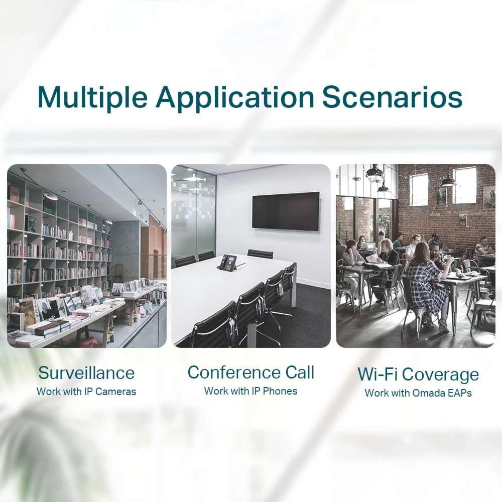 Compliance with the 802.3af PoE standard supports up to 15.4 W on each PoE port. The total 41 W PoE power budget* for the 4× PoE ports opens up a wide range of applications, such as surveillance for offices, dormitories, and small businesses. It is fully compatible with IP cameras, access points, IP phones, computers, printers, and more.