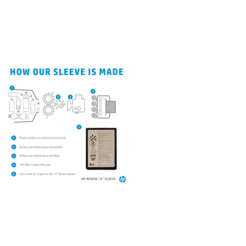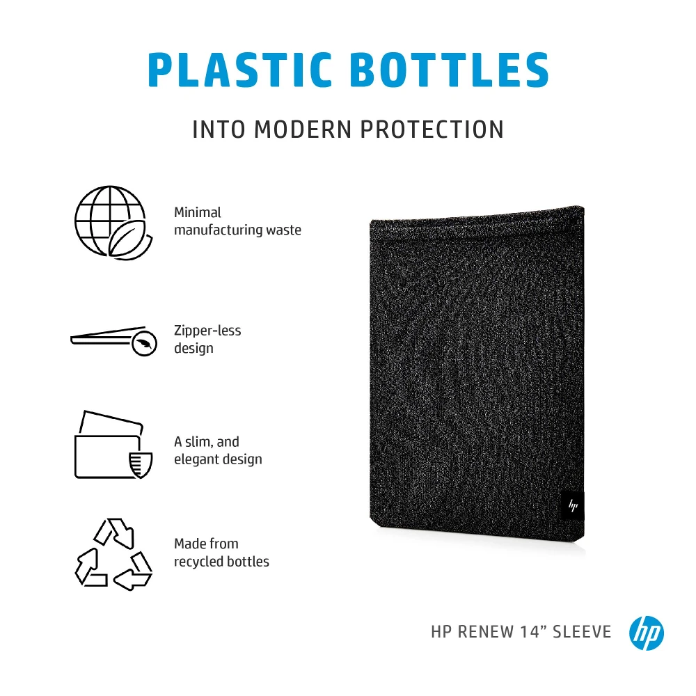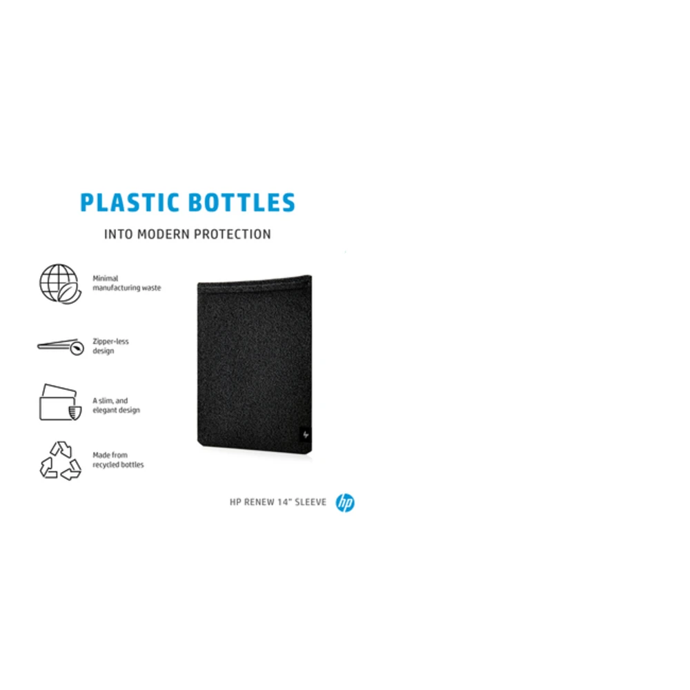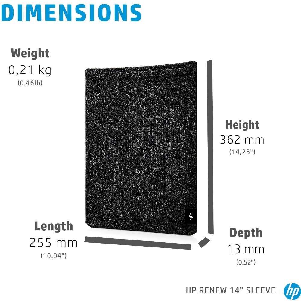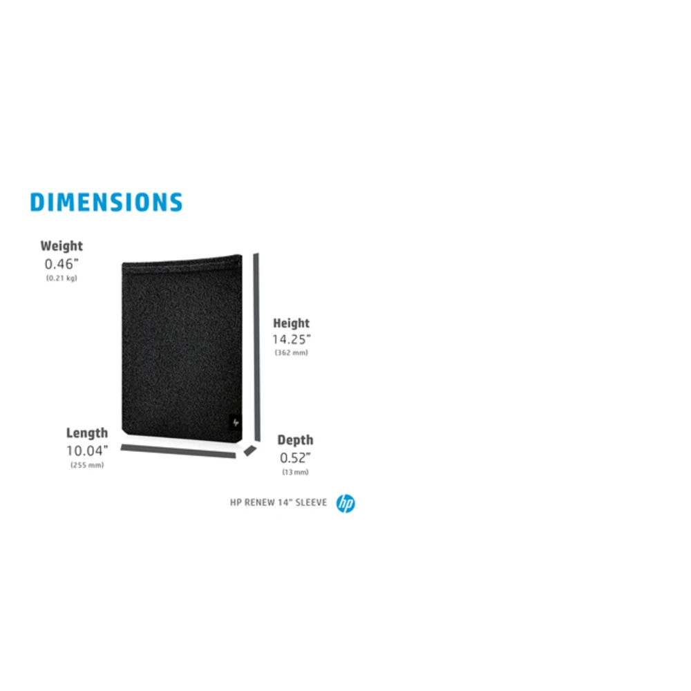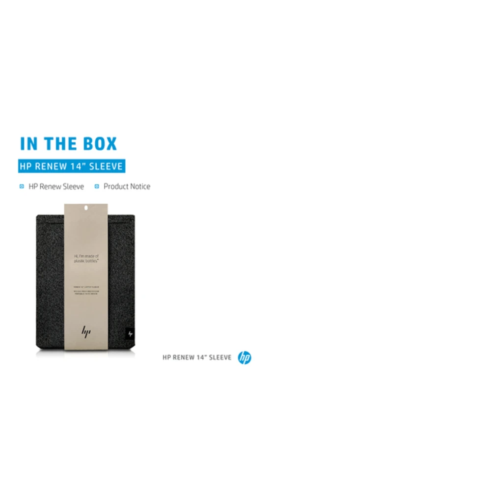 HP Renew 14 Laptop Sleeve. Case type: Sleeve case, Maximum screen size: 35.6 cm (14"), Number of compartments: 1. Weight: 210 g. Surface coloration: Monochromatic