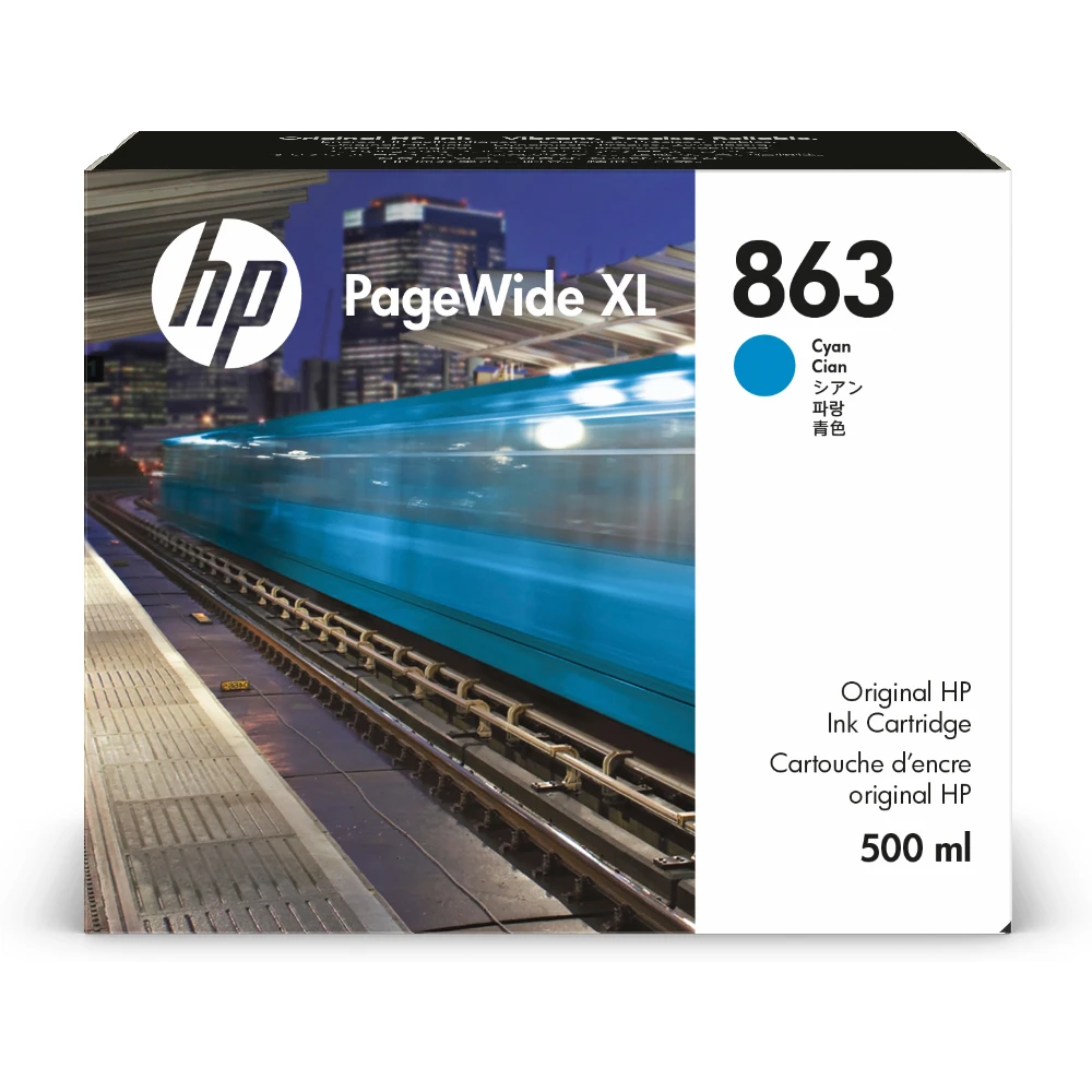 HP 863 500-ml Cyan PageWide XL Ink Cartridge. Colour ink type: Dye-based ink, Supply type: Single pack, Colour ink volume: 500 ml, Quantity per pack: 1 pc(s)