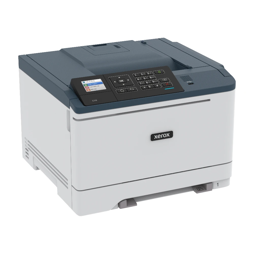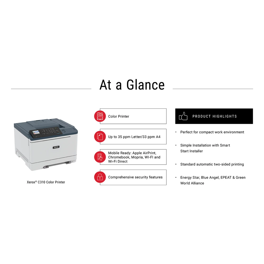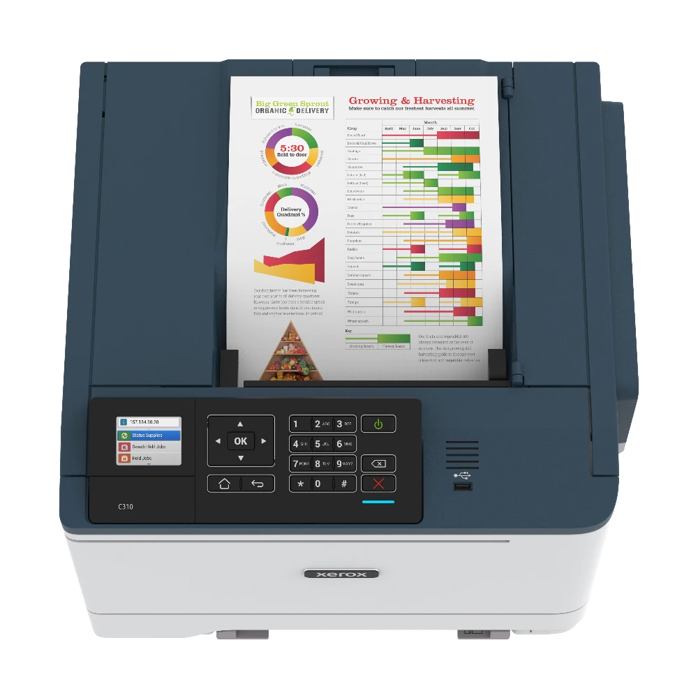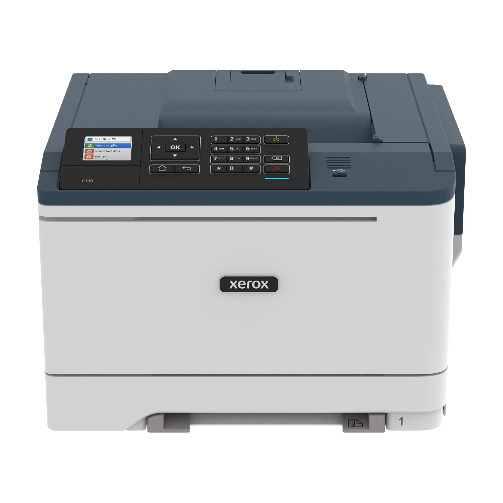 Xerox C310 Color Printer Xerox C310 Color Printer. Print technology: Laser, Colour. Number of print cartridges: 4, Maximum duty cycle: 80000 pages per month. Maximum resolution: 1200 x 1200 DPI. Maximum ISO A-series paper size: A4. Print speed (black, normal quality, A4/US Letter): 35 ppm, Duplex printing. Display: LCD. Network ready, Wi-Fi. Product colour: Blue, White The affordable Xerox C310 Color Printer is built for fast, nimble offices and home offices that need a color printer that can keep up with them. Easy to set up with Xerox® Smart Start Software and ready to work hard right out of the box. This device was designed for high-demand print environments, with an easy to use interface, automatic 2-Sided printing on letter and legal size paper with standard paper capacity of 250 sheets. Built-in wireless and Wi-Fi Direct functionality lets you print directly from mobile devices and tablets. Designed with a recommended monthly print volume of up to 1,500 pages per month, a 1 GHz dual core processor, 1 GB memory, and print speeds up to 35 Letter pages per minute/ 33 A4 pages per minute the C310 is a workhorse. Achieving EPEAT certification means the C310 Color Printer meets comprehensive criteria for design, production, energy use, and recycling. Our Green World Alliance program offers hassle-free toner cartridge recycling.