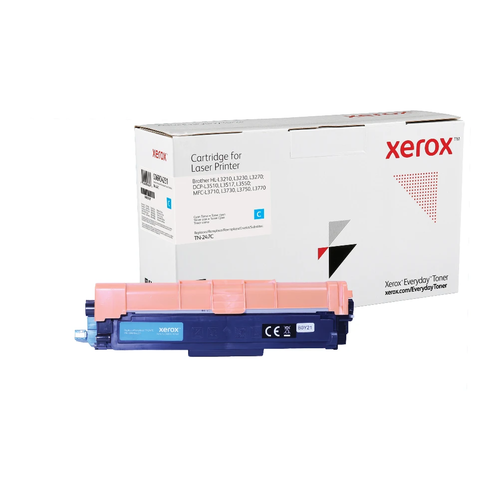 Everyday Cyan Toner compatible with Brother TN-247C, High Yield Everyday Cyan Toner compatible with Brother TN-247C, High Yield. Black toner page yield: 2300 pages, Printing colours: Cyan, Quantity per pack: 1 pc(s) Everyday Cyan Toner compatible with Brother TN-247C, High Yield, by Xerox. Comes with a lifetime warranty and is designed for optimum quality, performance, reliability, and safety. Offered at a significantly lower cost compared to cartridges from original manufactures, the Everyday? Toner portfolio includes cartridges for major printer and copier brands. They meet or exceed industry standards for global safety and environmental compliance and may be returned to Xerox free of charge for recycling in an environmentally responsible way.