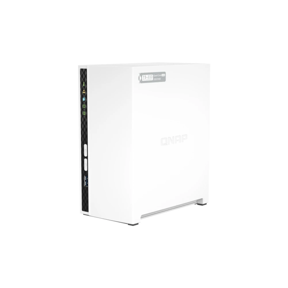 2 x 3.5", ARM 4-core Cortex-A55, 2 GB RAM, 4 GB Flash, LAN, 65 W, 100-240 V, 188.64 x 90.18 x 156.26 mm, 1.11 kg QNAP TS-233. Supported storage drive types: HDD & SSD, Storage drive interface: Serial ATA II, Serial ATA III, Supported storage drive interfaces: Serial ATA. Processor family: ARM, Processor model: Cortex-A55, Processor frequency: 2 GHz. Internal memory: 2 GB, Maximum RAM supported: 2 GB, Flash memory: 4000 MB. Ethernet LAN data rates: 10,100,1000 Mbit/s, Supported network protocols: IPv4, IPv6. Chassis type: Mini Tower, Cooling type: Active, Product colour: White Run your own personal cloud storage and enjoy easy file access, sharing, and syncing with the TS-233. Designed to enhance collaboration and increase remote work productivity, the TS-233 also features rich multimedia applications and provides a complete home entertainment portal.