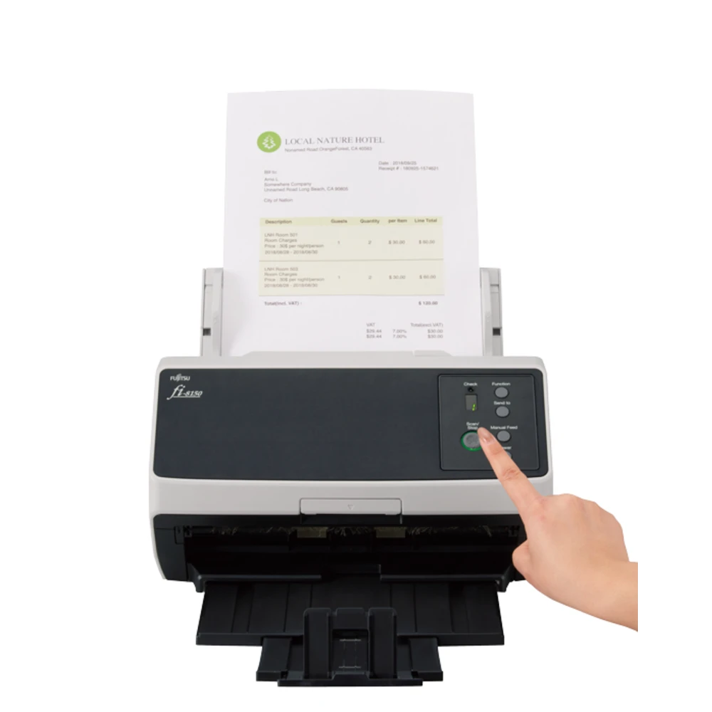 Fujitsu fi Series fi-8150 50ppm/100ipm A4 Duplex ADF USB3.2 LED Workgroup Scanner. Fujitsu FI-8150. Maximum scan size: 216 x 355.6 mm, Optical scanning resolution: 600 x 600 DPI, ADF scan speed (b/w, A4): 50 ppm. Scanner type: ADF + Manual feed scanner, Product colour: Black, Grey, Control type: Buttons. Sensor type: Dual CIS, Light source: LED, Scan file formats: JPEG, PDF, PNG, TIFF. Auto document feeder (ADF) input capacity: 100 sheets. Maximum ISO A-series paper size: A4, Scanning media types supported: Business Card, Post Card(JPN), ISO A-series sizes (A0...A9): A4, A5, A6 As the evolution of the market?s leading image scanners, the Fujitsu fi-8000 series redefines the standard for business scanning by solving today?s challenges and providing a long-term strategic advantage for organisations adapting to the future of work. Boasting breakthrough optical technology and a wide range of innovative new patents, the Fujitsu fi-8000 series supports digital transformation with industry-leading accuracy and user experience, built on technology you can trust.