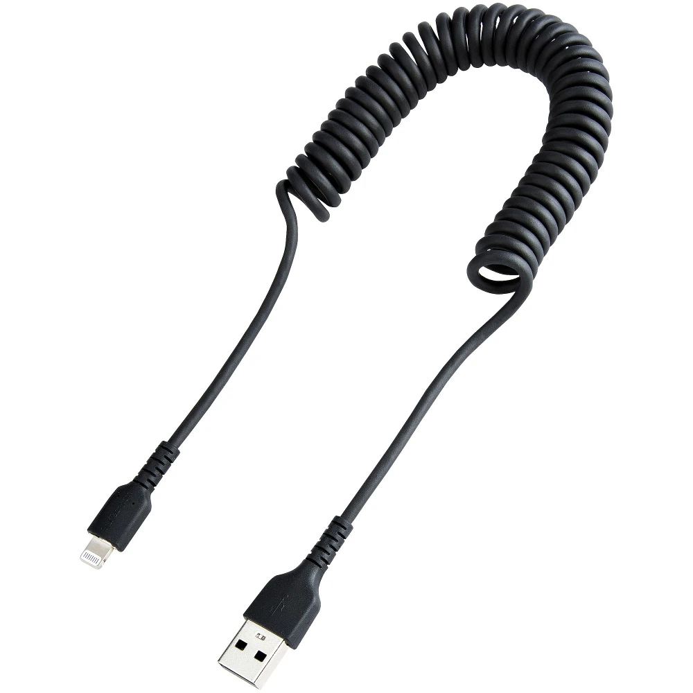 1m (3ft) USB to Lightning Cable, MFi Certified, Coiled CableThis coiled Lightning to USB A cable can withstand the daily demands of charging and syncing your mobile devices. It contracts to 1.2ft (38cm) making it compact and convenient to store.Built for Daily UseThe durable Lightning charging cable has aramid fiber reinforcement that shelters it from the stress of frequent bends. This also lets the cable flex without over-stretching or damaging the core of the cable.Flexible Strain ReliefThe Lightning to USB A cable is constructed to prevent the connector from separating from the jacket. The extra-long strain relief molding is tested to withstand over 5,000+ bend cycles at a 180? angle.Superior ConnectionThe durable cable supports all USB 2.0 specifications providing a dependable connection for all your Lightning devices. It is also Apple MFi certified which is guaranteed for fast and reliable charge and sync from USB-A charging ports.RUSB2ALT1MBC is backed by a StarTech.com? 2-year warranty and free lifetime technical support.The StarTech.com Advantage