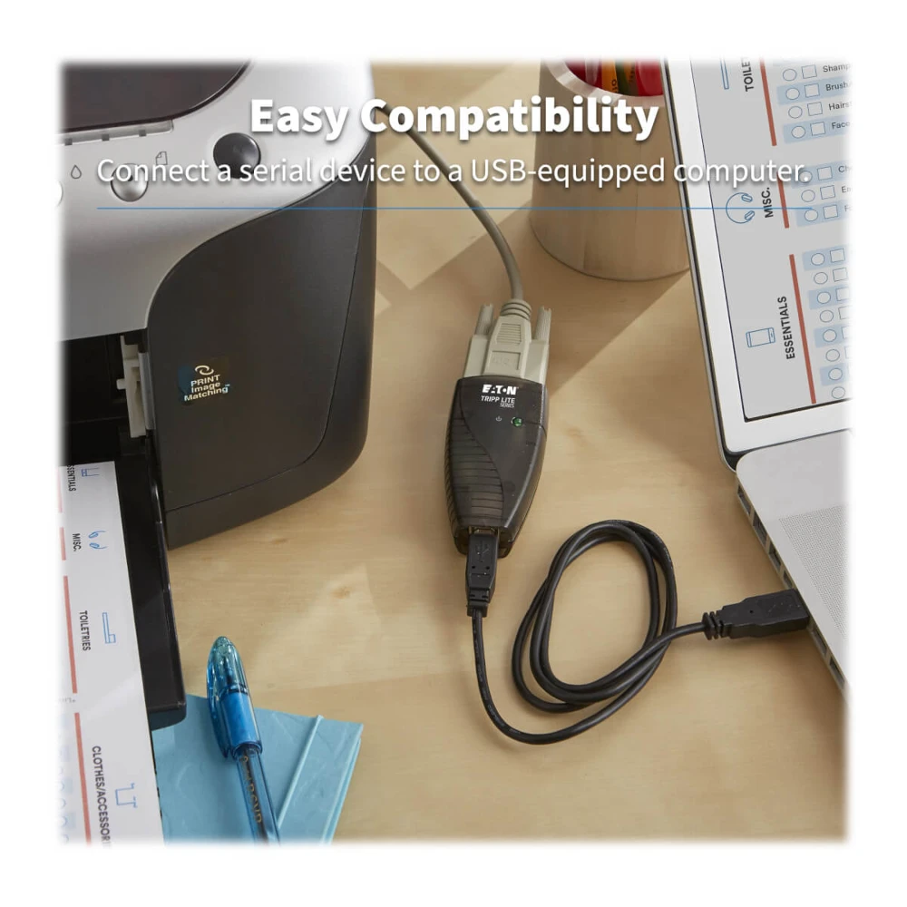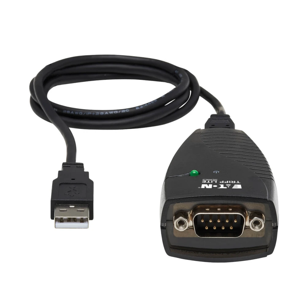 Tripp Lite USA-19HS Keyspan USB to Serial Adapter - USB-A Male to DB9 RS232 Male, 3 ft. (0.91 m), TAA. Host interface: USB, Output interface: Serial, Serial interface type: RS-232. Product colour: Black, Country of origin: Taiwan, Certification: REACH, CE, FCC. Baud rate: 230 Kbit/s. Width: 40.6 mm, Depth: 78.7 mm, Height: 25.4 mm. Cables included: USB, Package width: 228.6 mm, Package depth: 152.4 mm