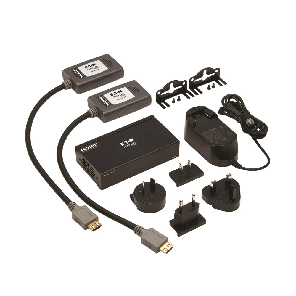 The splitter and receivers work right out of the package with no software required. Mounting hardware is included for installing the splitter on a wall, pole or 19-inch rack. Connect the splitter to an HDMI source device with a user-supplied HDMI cable (such as P568- or P569-Series). The receivers’ pigtail HDMI connectors plug directly into a 4K display.