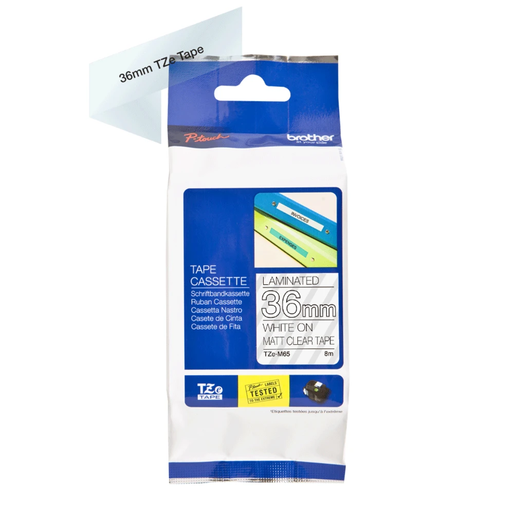 Matt Laminated Labelling Tape Cassette ? White On Clear, 36 mm wide Brother TZe-M65. Compatibility: PT-P900W PT-D800W PT-P950NW P-touch CUBE Pro PT-3600 PT-9600 PT-9700PC PT-9800PCN, Printing colours: Black, Product colour: Transparent. Ribbon width: 3.6 cm, Ribbon length: 8 m. Package type: Blister, Quantity per pack: 1 pc(s) This genuine Brother TZe-M65 matt laminated labelling tape cassette is guaranteed to provide you with crisp, sharp and easily readable labels that last.
