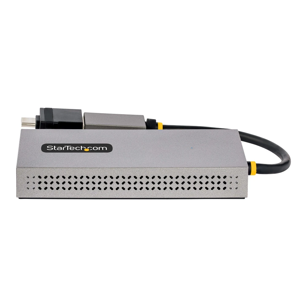 StarTech.com USB 3.0 or USB-C to Dual HDMI Adapter for Windows & macOS, 2x HDMI Displays (1x 4K30Hz, 1x 1080p), Integrated USB-A to C Dongle, 4in/11cm Cable (107B-USB-HDMI) StarTech.com USB to Dual HDMI Adapter, USB A/C to 2x HDMI Displays (1x 4K30Hz, 1x 1080p), Integrated USB-A to C Dongle, 4in/11cm Cable, USB 3.0 to HDMI Display Adapter, Windows & macOS. USB connector type: USB Type-A, USB Type-C, USB connector gender: Male, USB connector form factor: Straight. Product colour: Grey, USB cable length: 0.11 m. Windows operating systems supported: Windows 10, Windows 10 Education, Windows 10 Education x64, Windows 10 Enterprise, Windows 10..., Mac operating systems supported: Mac OS X 10.14 Mojave, Mac OS X 10.15 Catalina, Mac OS X 11.0 Big Sur, Mac OS X 13.0 Ventura, Other operating systems supported: ChromeOS. Width: 50 mm, Depth: 100 mm, Height: 15 mm. Products per master (outer) case: 60 pc(s), Master (outer) case width: 490 mm, Master (outer) case length: 370 mm - USB to Dual HDMI Adapter connects up to 2x HDMI monitors (1x 4K 30Hz + 1x 1080p) to a computer using the built-in USB-A/USB-C cable; 2ch HDMI Audio | USB to HDMI Converter is bus-powered | 4" (11cm) attached cable - Supports 3 displays in extended mode incl. the laptop screen | 4K output supports ultrawide displays up to 3440x1440 30Hz - Multi-Monitor Video Adapter works w/ Windows/macOS/ChromeOS - Attached USB-A to USB-C dongle to connect to USB Type-C laptops/desktops | Compact form factor Multi-Monitor USB-A or USB-C Adapter | 1x 4K 30Hz + 1x 1080p | Windows, macOS, & ChromeOSThis USB to Dual HDMI® Adapter enables the addition of two independent HDMI displays (1x 4K & 1x 1080p) to your computer, using a single USB Type-A 3.2 Gen 1 (5 Gbps) connection.Increase Productivity with Multiple DisplaysThis USB to HDMI Dual Monitor Adapter features two video outputs, boosting productivity by connecting up to two displays using a single USB Type-A or C port. The adapter is bus-powered, lightweight, and features an integrated 4.3" (11cm) USB cable, making it ideal for transitioning between the office, home, or connecting to displays in a boardroom.4K ResolutionConnect a 4K 30Hz and a 1080p display to a laptop or desktop. The USB to Multi-Monitor Adapter supports extended or mirrored display modes, and ultrawide displays, providing additional viewing space.Wide-Ranging System CompatibilityThe USB video adapter is compatible with Windows, macOS, and ChromeOS. The integrated USB-A to USB-C dongle ensures USB compatibility with any host running a supported operating system. The attached 4.3in (11cm) cable is convenient for on the go use.107B-USB-HDMI is backed for 3-years by StarTech.com, including free 24/5 multi-lingual technical assistance.The StarTech.com Advantage